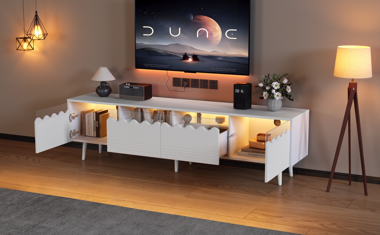 - Grand espace de rangement : Mesurant 176 x 38 x 45 cm, ce meuble TV est doté de deux tiroirs, deux placards et une étagère ouverte. Il peut dissimuler décodeurs et consoles de jeux, accueillir un téléviseur de 75 pouces et transformer votre salon, d'un espace encombré à un espace organisé, en un clin d'œil.