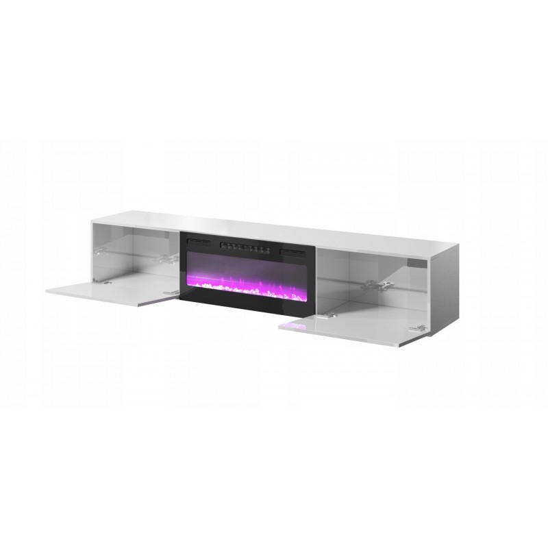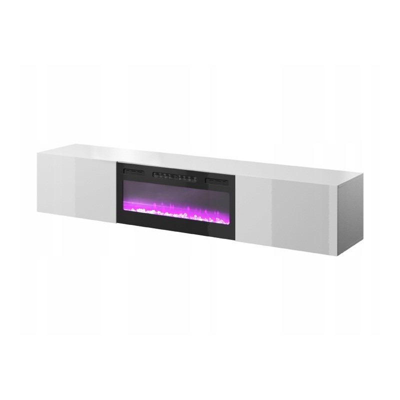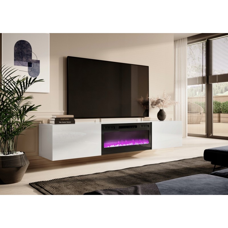 Meuble TV Blanc brillant 200x37x40cm Avec Cheminée chauffante intégrée SLIKA K à suspendre