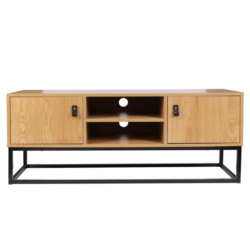 Meuble de télévision 2 portes et 2 niches piètement métal noir. Vous aimerez le style authentique du meuble TV Abbott. Les niches sont percées au fond pour permettre le passage des câbles. A monter soi même. Dimensions : L117 x l39 x H48 cm. Poids : 21 kg. Matière : Fibres de bois MDF et métal. Marque : Home Déco Factory.