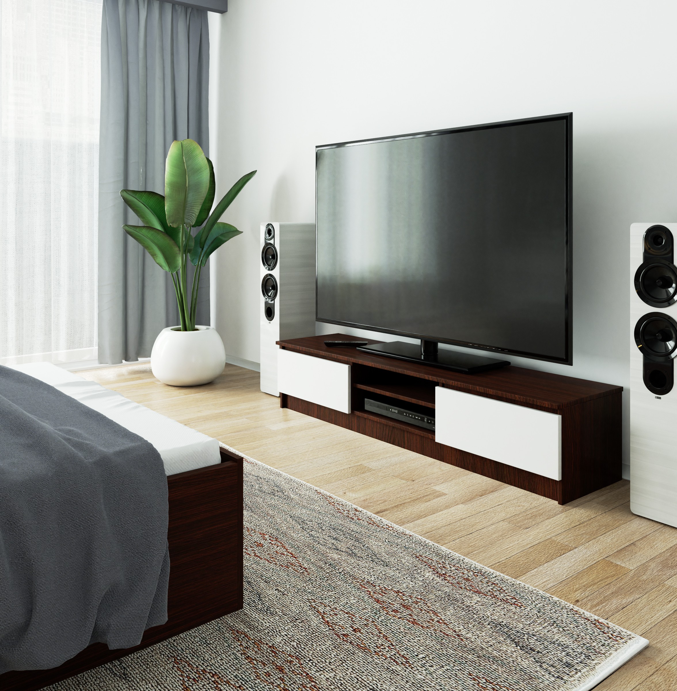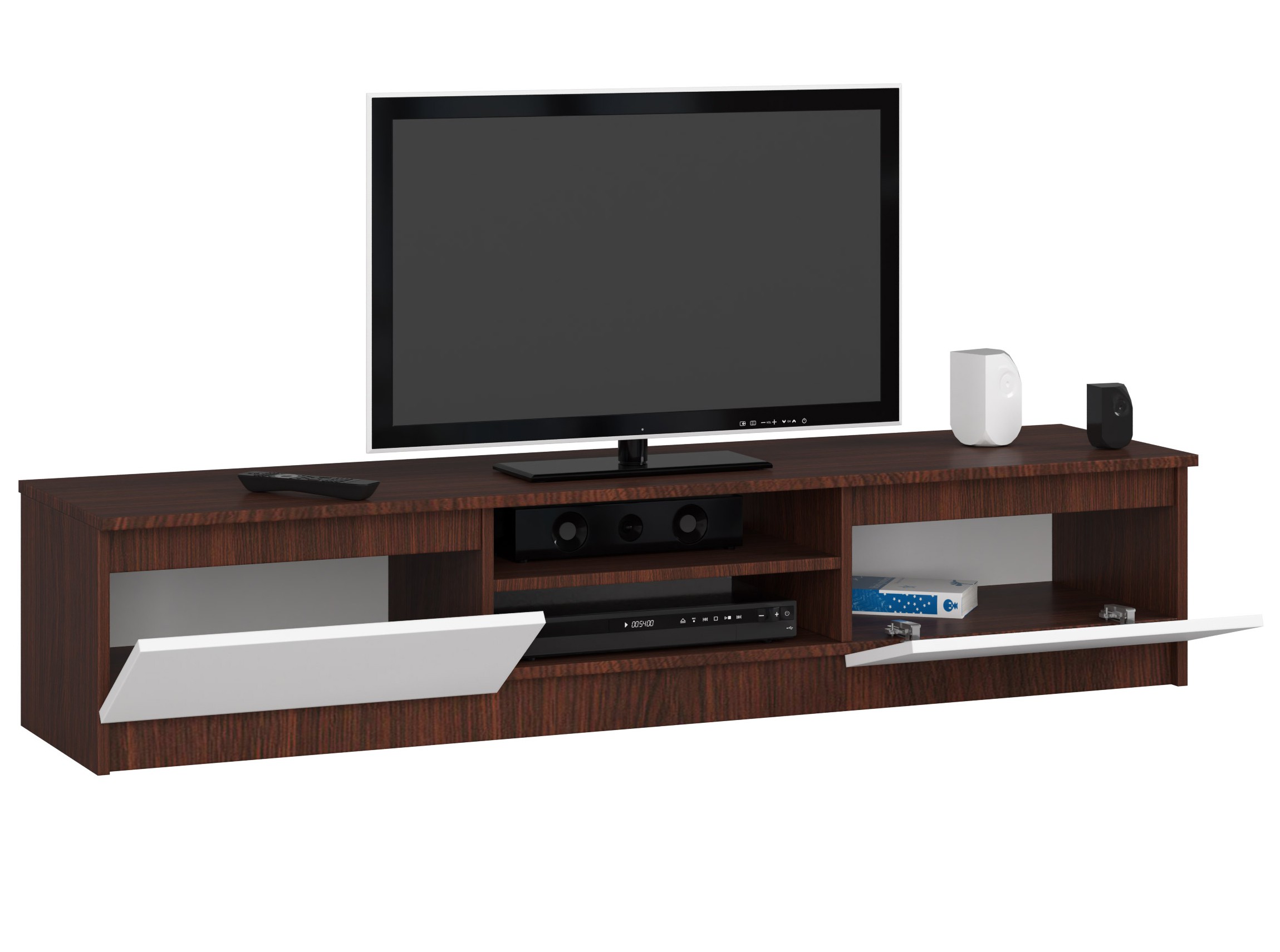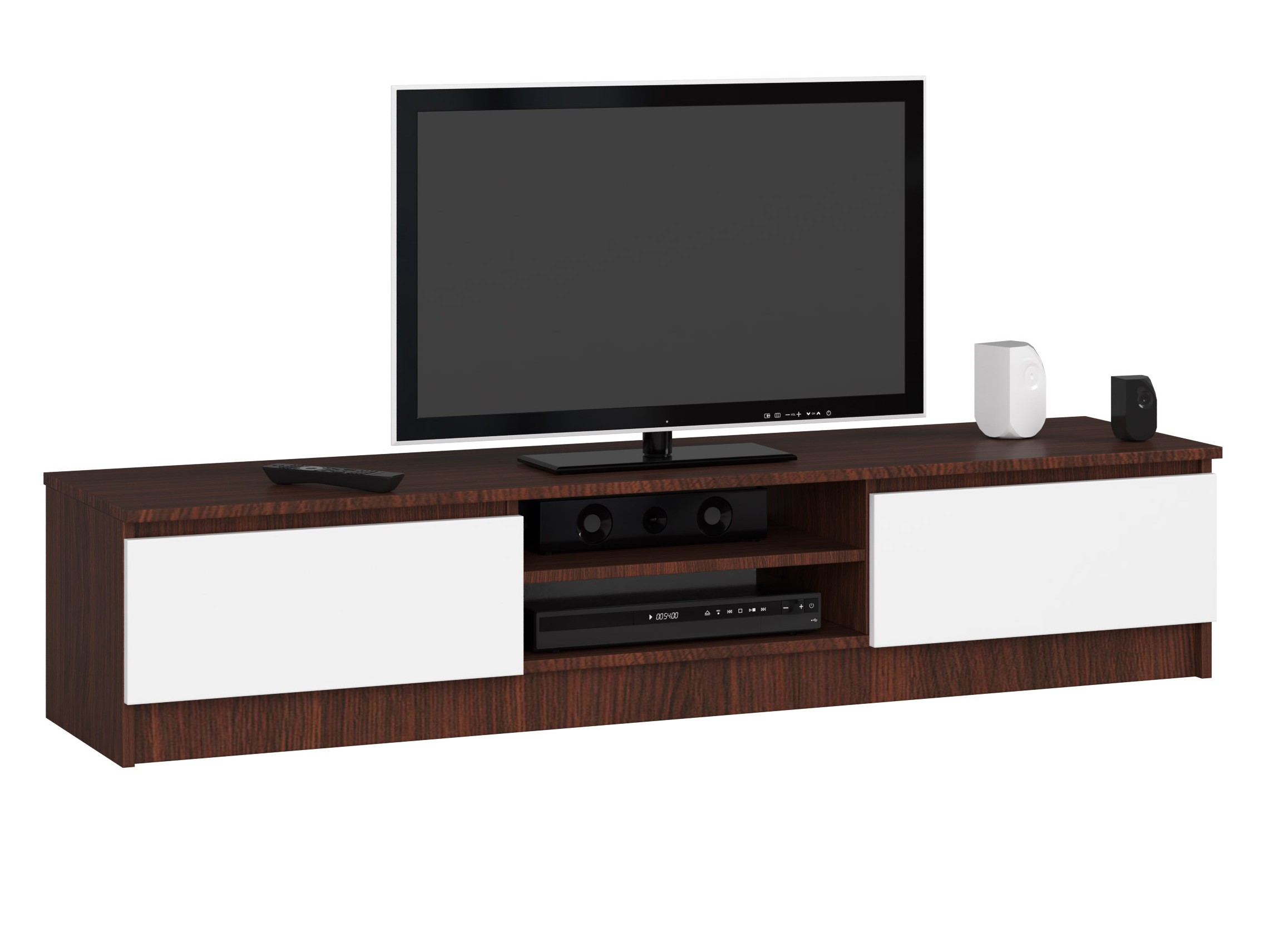 Meuble TV pour salon AKORD Wengé 160 cm 2 portes façade Blanche 2 étagères 160x40x33 cm