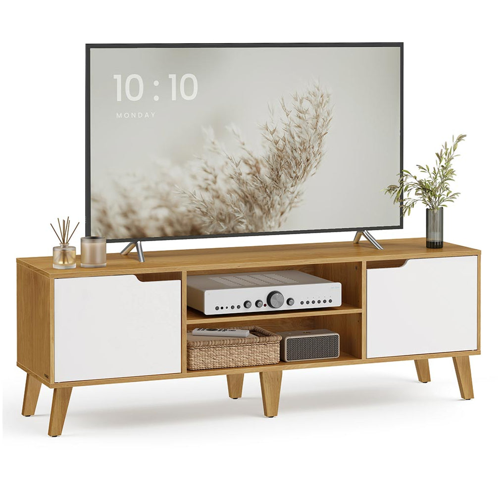 Avec son design élégant et ses pieds inclinés, ce meuble TV apporte une ambiance transitionnelle chic à votre salon ou votre chambre. Ses lignes épurées et ses finitions en chêne naturel et blanc crème en font un élément décoratif qui se marie facilement avec différents styles d’intérieur.