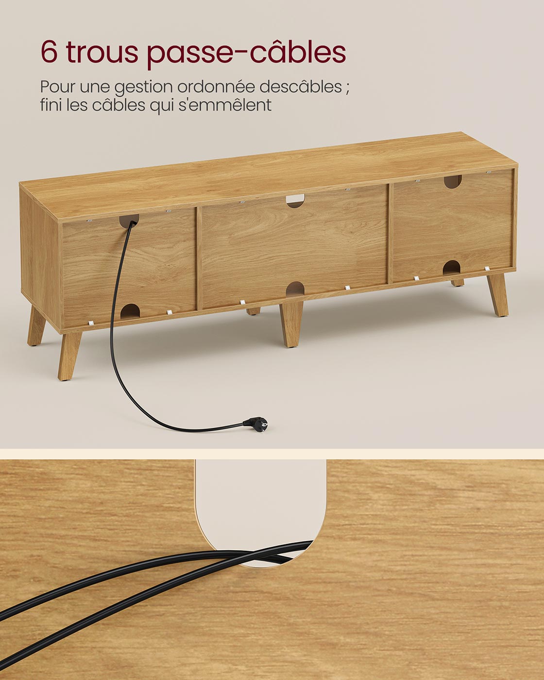Ce meuble propose également un espace de rangement généreux avec deux placards latéraux, deux compartiments ouverts et une étagère réglable pour accueillir objets et accessoires de tailles variées. Les 6 passe-câbles à l’arrière permettent de maintenir vos branchements bien organisés et discrets.