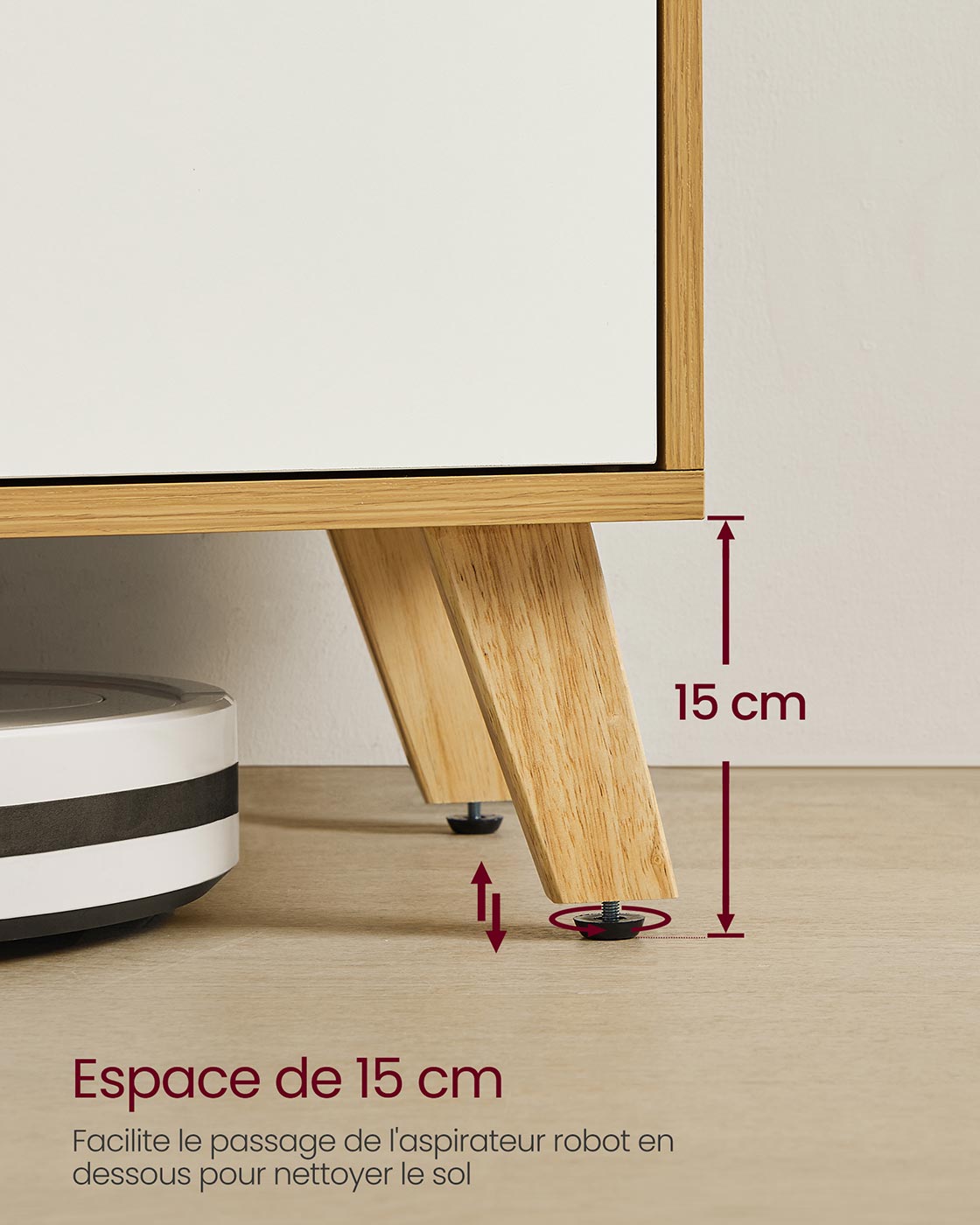 Pratique, il est doté de pieds surélevés de 15 cm facilitant le passage des robots aspirateurs et de pieds réglables pour assurer une stabilité parfaite, même sur un sol légèrement irrégulier.