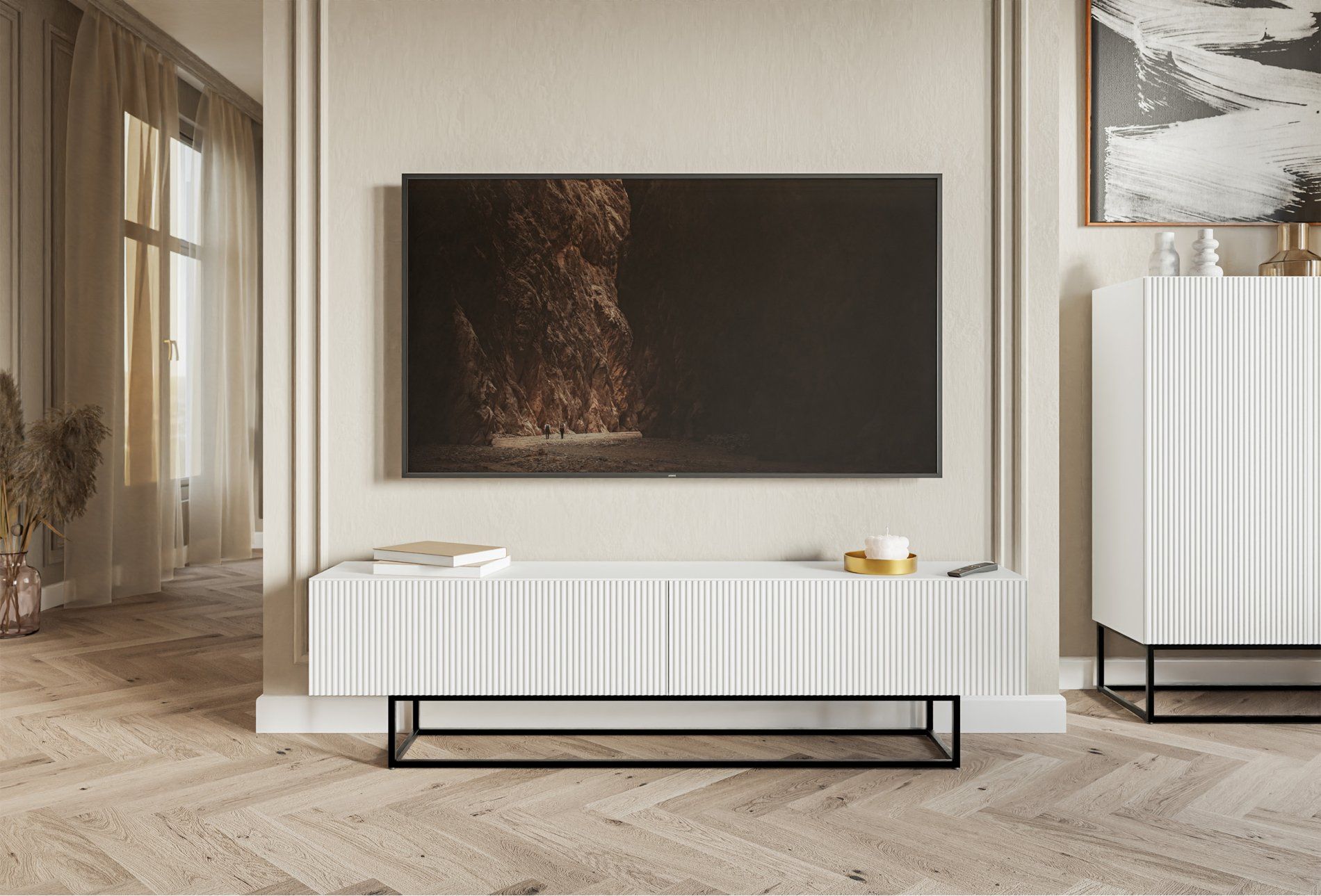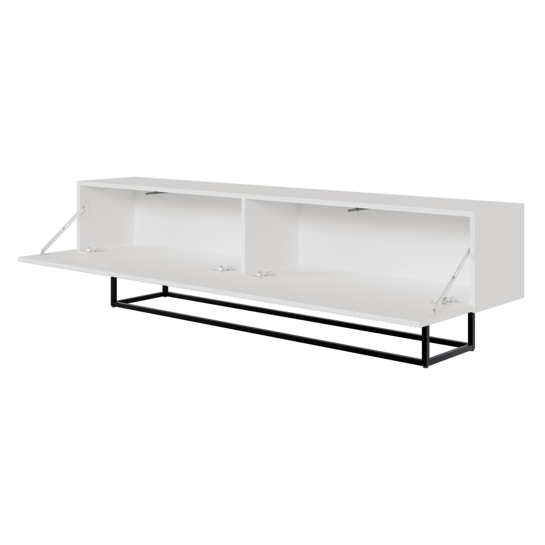 Les façades de meuble TV sont en MDF, les façades s'ouvrent vers le bas à l'aide de la méthode push-to-open.