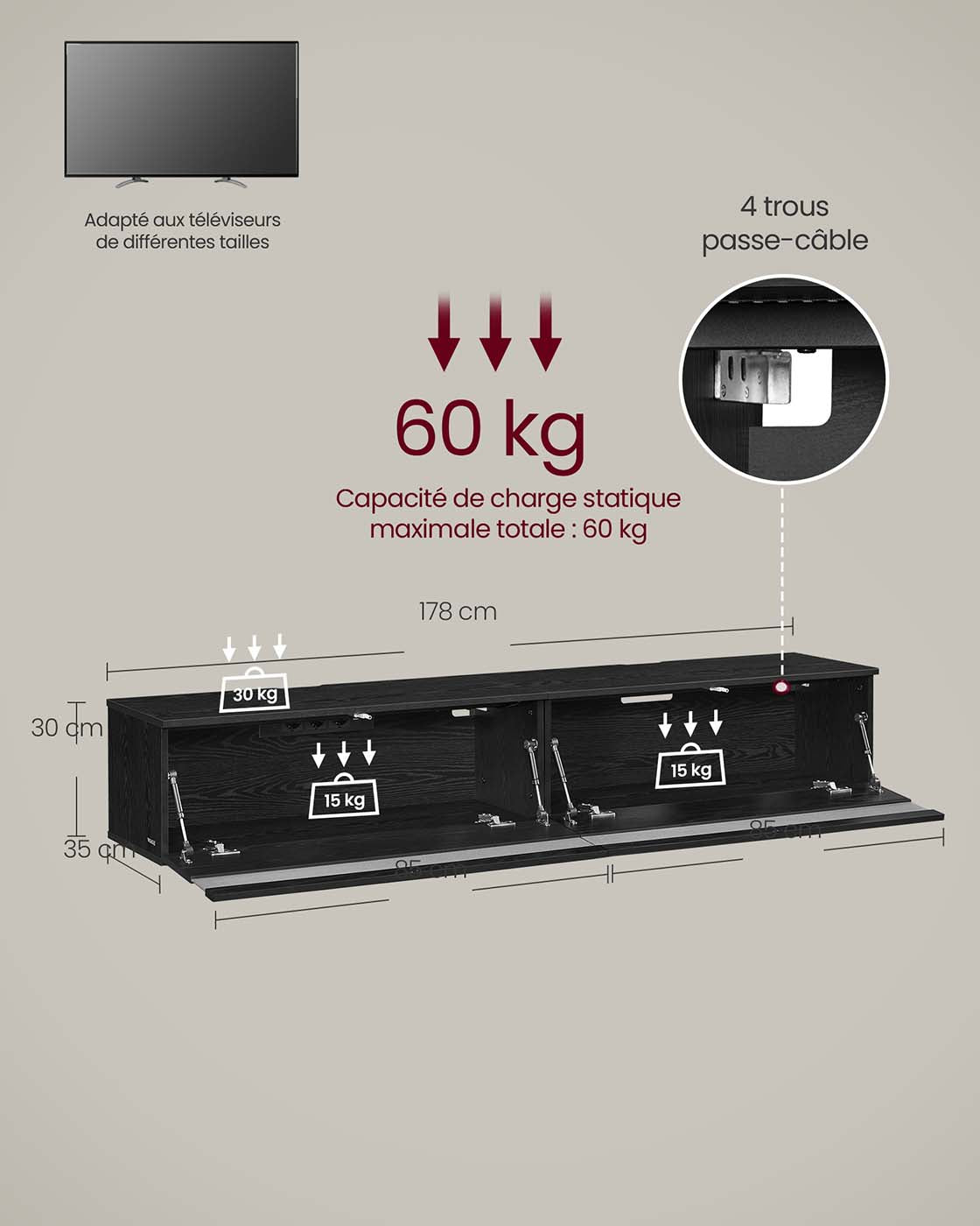 Mesurant 178 x 35 x 30 cm, il est équipé d’une barre de renfort sous la tablette supérieure, ce qui lui permet de supporter jusqu’à 30 kg. Il convient ainsi à la plupart des téléviseurs et offre une installation fiable et sécurisée.