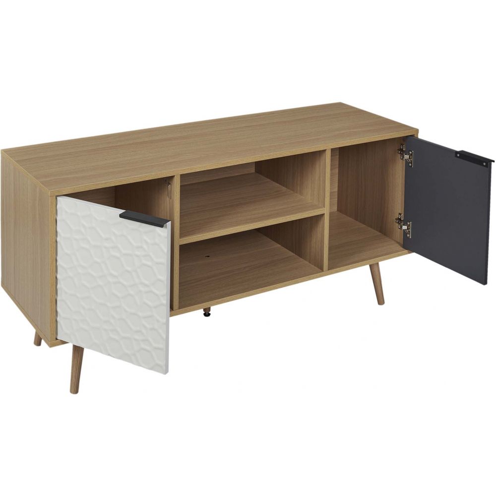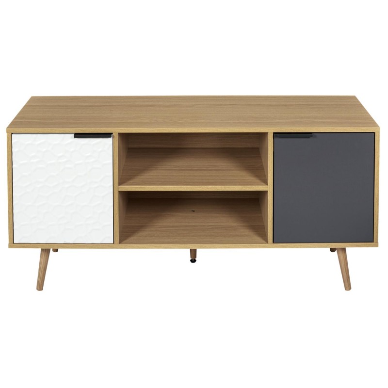 Meuble de télévision 2 niches et 2 portes sur pieds bois pour un style résolument scandinave. Adoptez l'effet matière de ce modèle pour votre salon avec sa porte gauche blanche texturée et sa porte droite grise lisse. A monter soi même. Dimensions : L120 x l39 x H56,30 cm. Poids : 21 kg. Matière : Panneaux de particules MDF. Marque : Home Déco Factory.