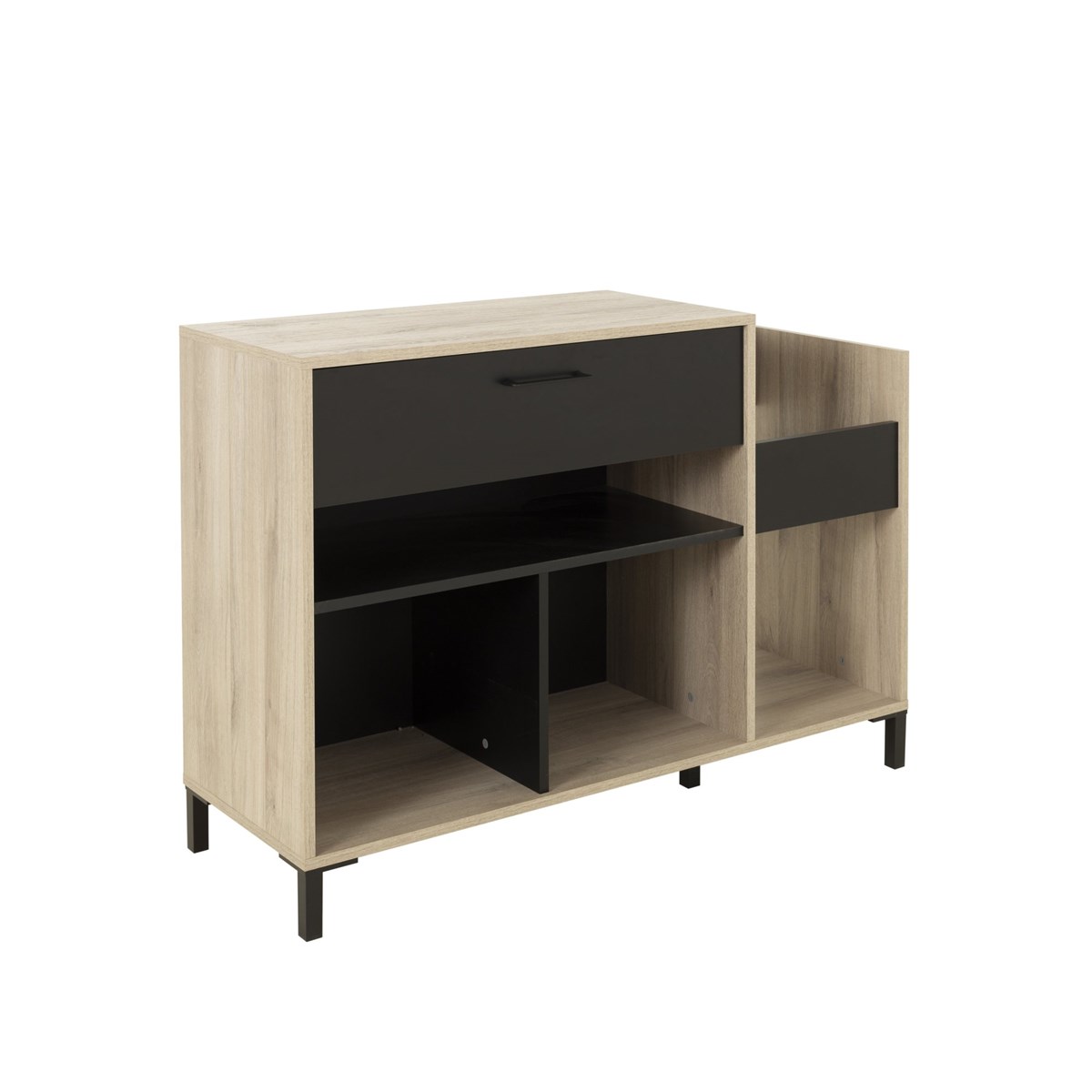 Corps et façades en panneaux de particules revêtus papier imitation Chêne Krönberg clair et uni Noir, chants même finition. Caisse tiroir en panneaux de particules revêtus polypropylène imitation textile sur coulisses à galets grises. Poignée en zamack noir. Pieds en ABS noir mat.