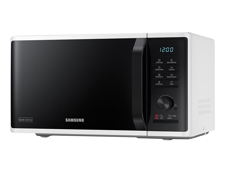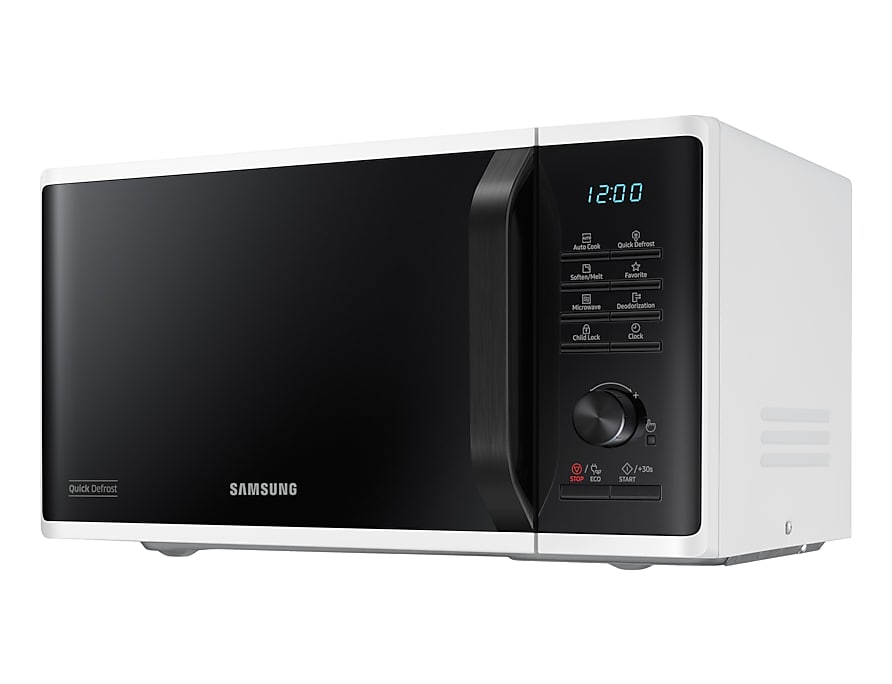 Micro-ondes solo - 6 niveaux de puissance - Commandes électroniques + bouton rotatif - 20 programmes Cuisson automatique + 4 programmes Fondre/Ramollir + 5 programmes de Décongélation automatique Quick Defrost : grâce à un nouvel algorithme, cette technologie réduit de manière importante le temps de décongélation nécessaire aux aliments, tout en réservant l’aspect et les qualités nutritionnelles - Fonction Désodorisation - Minuteur 99 min - Touche + 30 sec - Horloge 12/24 h - Mode Eco - Plateau tournant Ø 28,8 cm - Cavité en céramique émail : elle offre non seulement de meilleures performances de cuisson mais aussi une excellente résistance à l'usure et à l'abrasion, tout en facilitant le nettoyage - Sécurité enfants - Design incurvé et affichage LED bleues pour une esthétique moderne. Samsung MS23K3515AW/EF. Placement de l'appareil: Comptoir, Type de produit: Micro-ondes uniquement, Capacité intérieure: 23 L. Charge connectée: 1150 W, Tension d'entrée AC: 230 V, Fréquence d'entrée AC: 50 Hz. Largeur: 489 mm, Profondeur: 374 mm, Hauteur: 275 mm