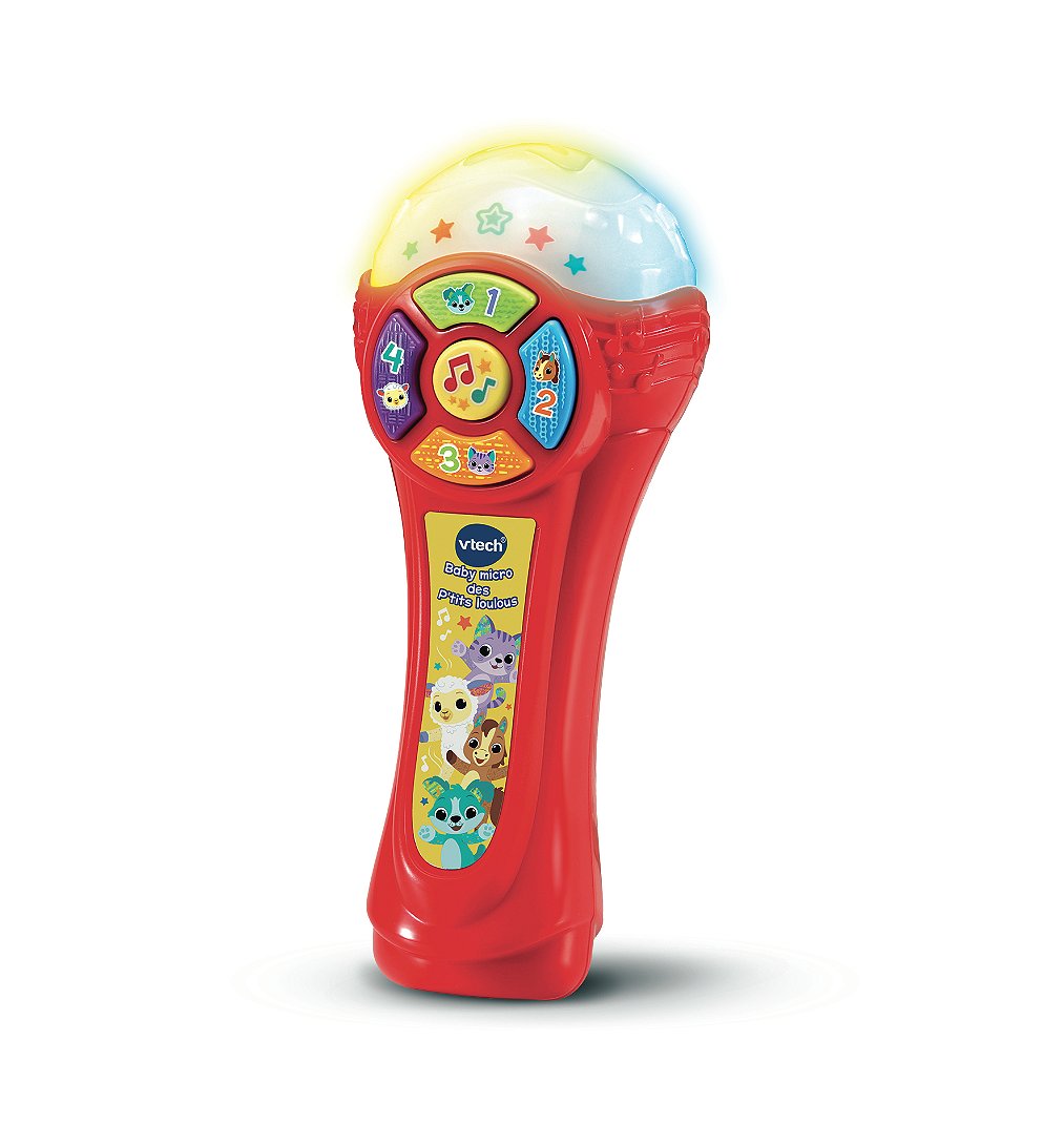Baby micro des P'tits loulous - 12 - 36 mois Un micro pour s’amuser et faire le plein de découvertes en chantant ! Le Baby micro des P'tits loulous est le micro idéal des tout-petits. Plein de couleurs, lumineux et facile à prendre en main, il contient des chansons et des mélodies qui incitent l'enfant à chanter. Magique, lorsque l’enfant chante, le micro s’illumine et change de couleur ! Les lumières changent au rythme des chansons et de la voix. Ses 4 boutons colorés permettent de découvrir les animaux, leur cri, ainsi que les chiffres pour apprendre en musique. Très complet, il possède un bouton Musique qui permet de déclencher 2 chansons amusantes et 15 mélodies. Le micro s’illumine en rythme avec la musique. Réglage du volume sonore. Boîte Try-me. Fonctionne avec 2 piles LR03 fournies.