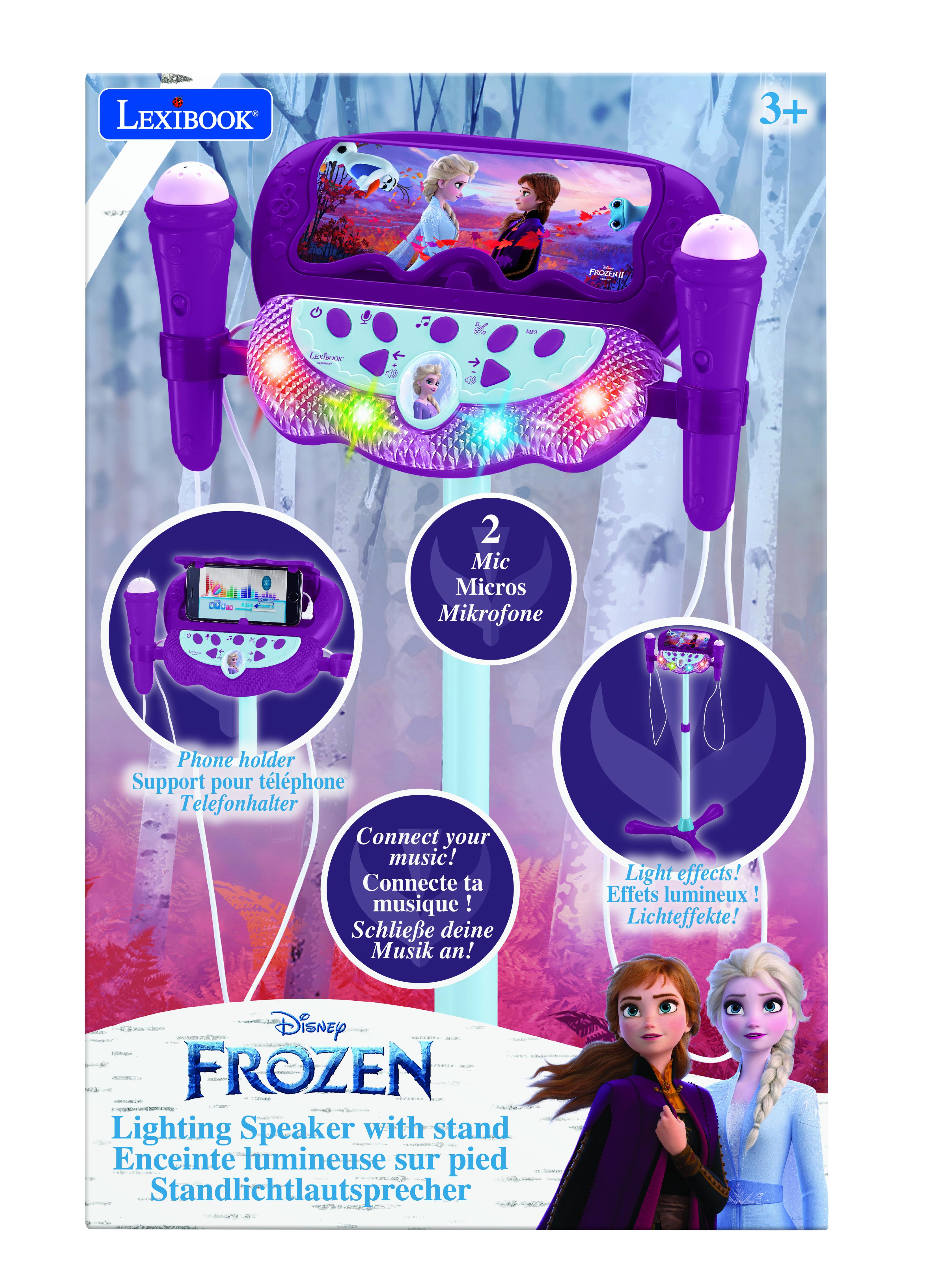 * Prépare-toi pour la scène avec cet adorable microphone La Reine des Neiges 2 ! * Connecte n'importe quel lecteur audio (smartphone non inclus) grâce au câble Aux-in et chante sur tes chansons préférées ! * Des effets lumineux sur l'enceinte pendant que tu chantes ! * La hauteur est ajustable (entre 60 et 95 cm) pour s'adapter à chaque musicien. * Enregistre ta performance directement sur le microphone. * 2 microphones sont inclus pour chanter en duo. * Un support pour téléphone est inclus pour te prendre en photo ou vidéo pendant ton spectacle, ou pour lire les paroles de tes chansons préférées. * Alimentation : 3 piles AA/LR6 de 1.5V (non fournies). * Garantie : 2 ans - Conçu en Europe - Fabriqué en Chine.