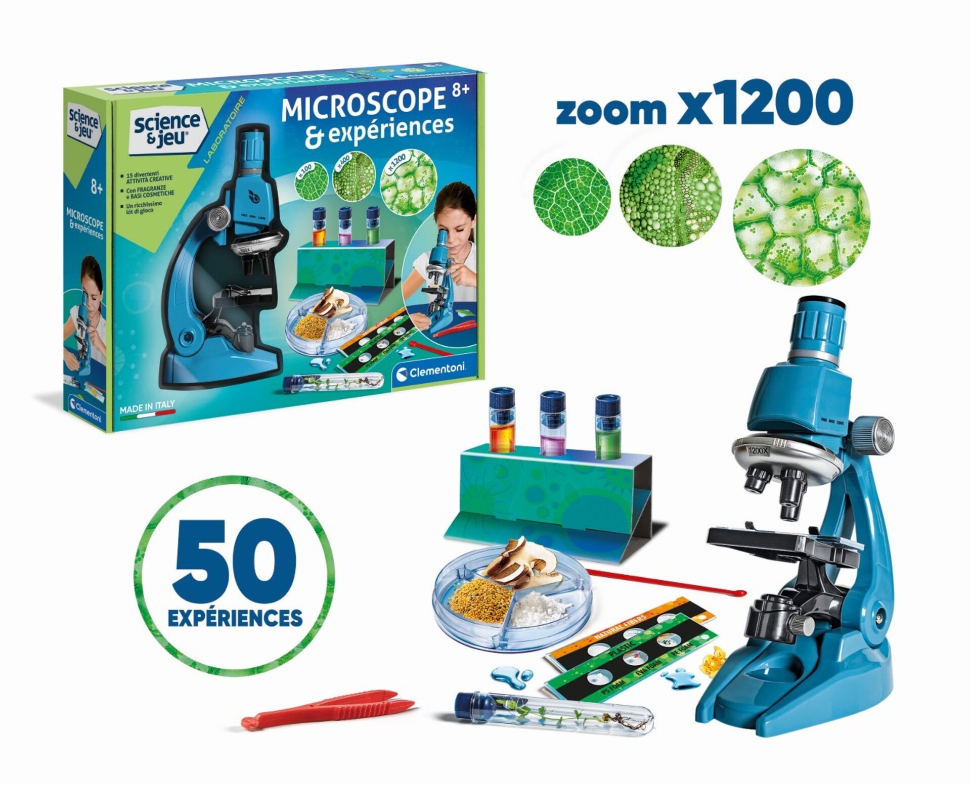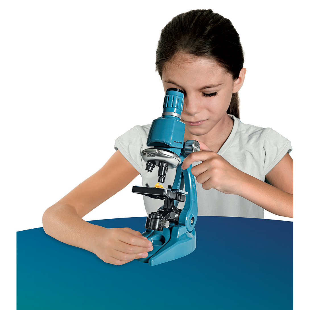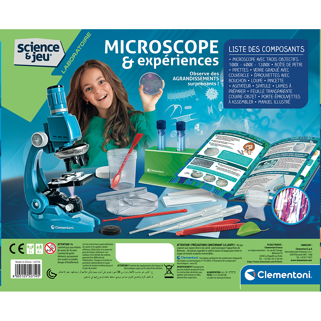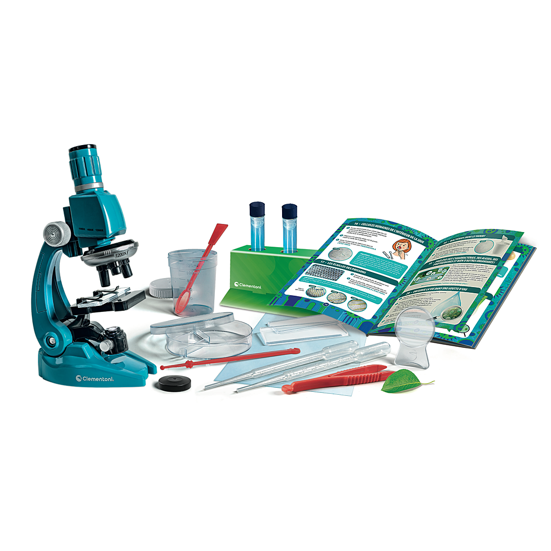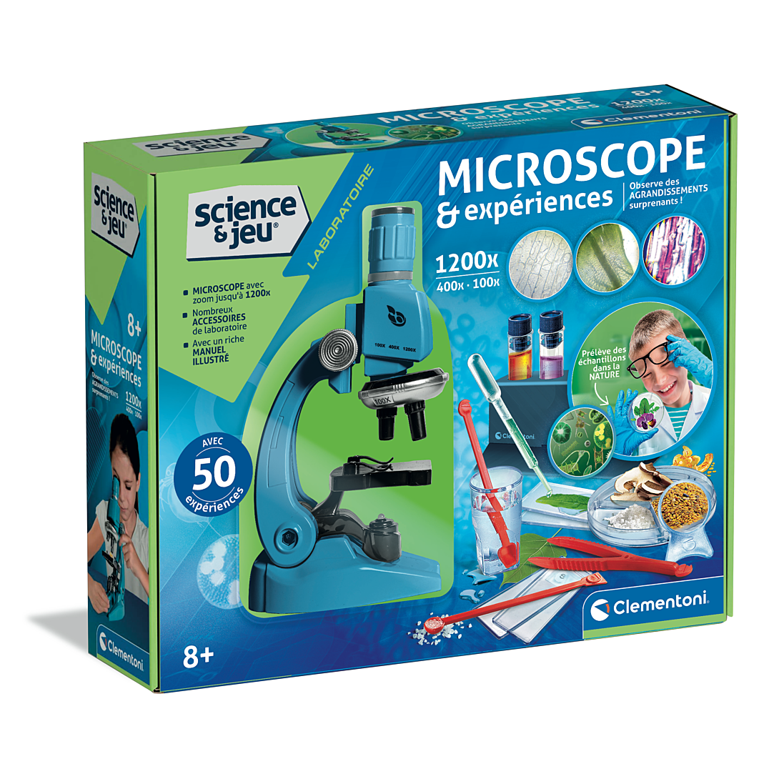 • Un véritable microscope professionnel, simple à utiliser, pour explorer le microcosme et le grossir jusqu'à 1200 fois. • Le coffret propose 50 expériences à réaliser, pour s'amuser avec la science en toute sécurité. • Contient de nombreux instruments pour observer le monde qui nous entoure : lames en plastique, éprouvettes, pipettes, loupe... • Le microscope est doté d'une lumière LED à intensité et inclinaison réglables.