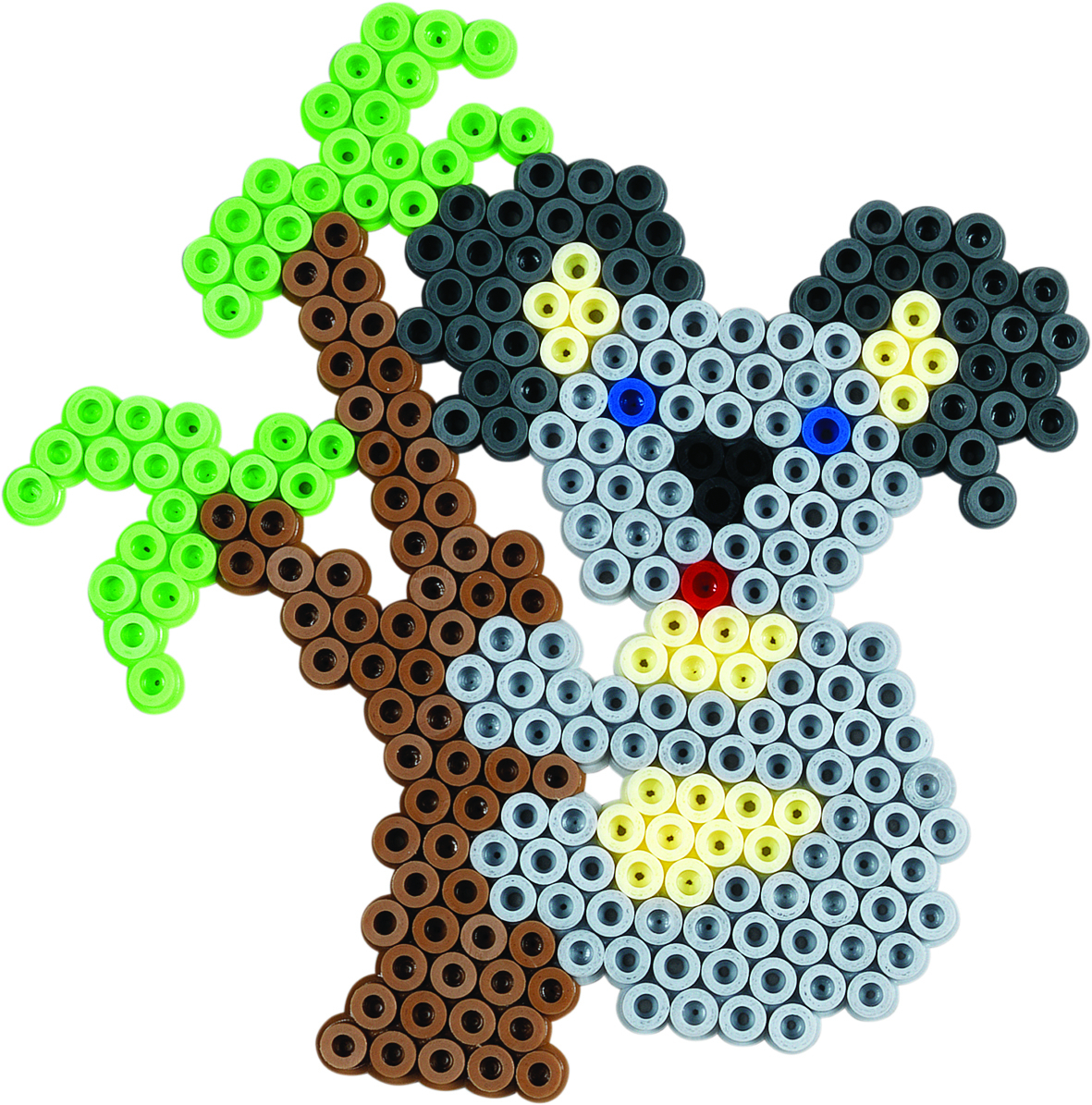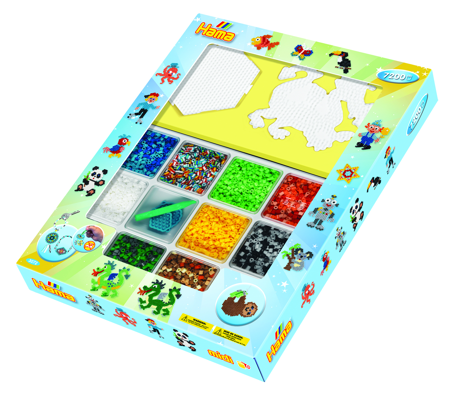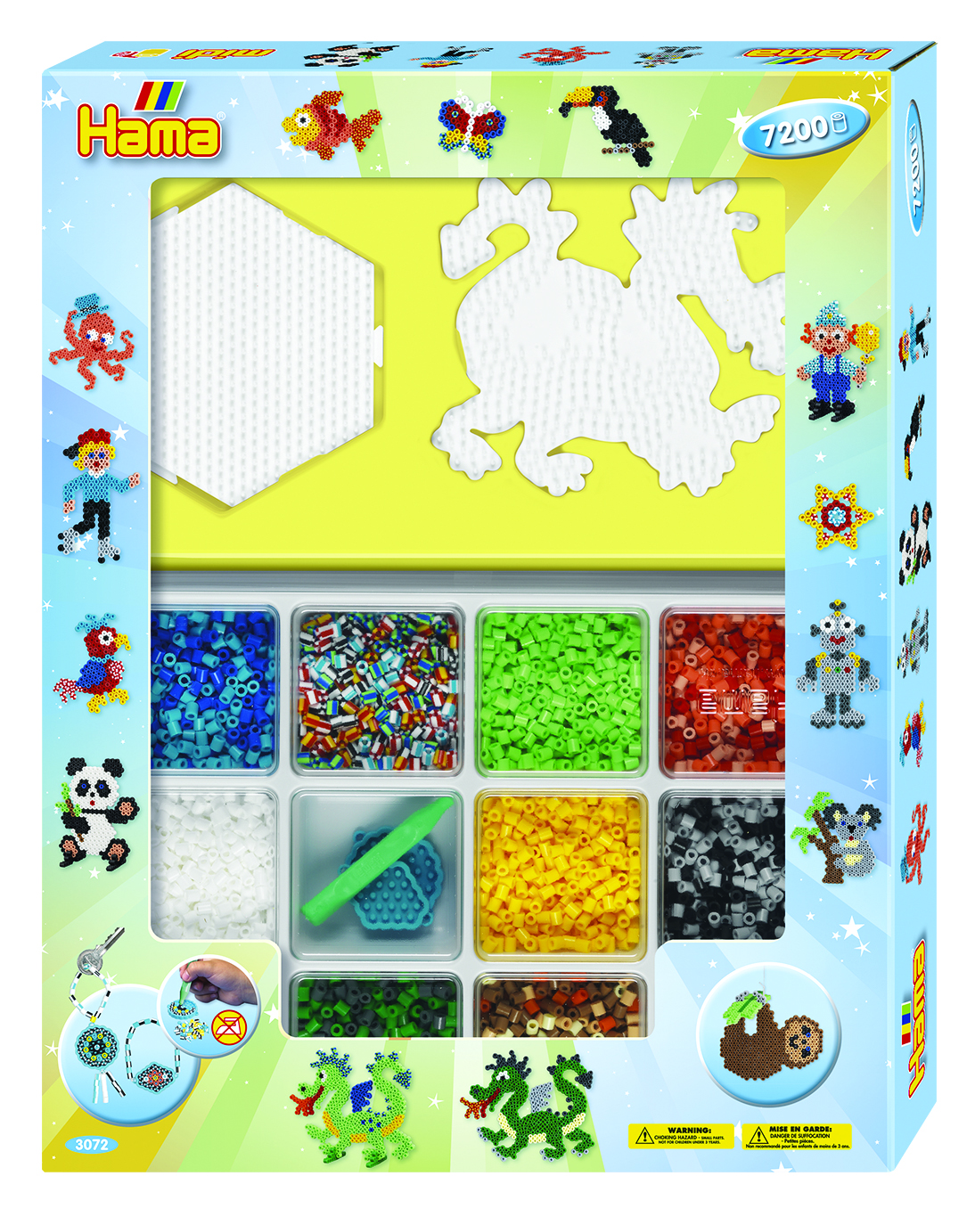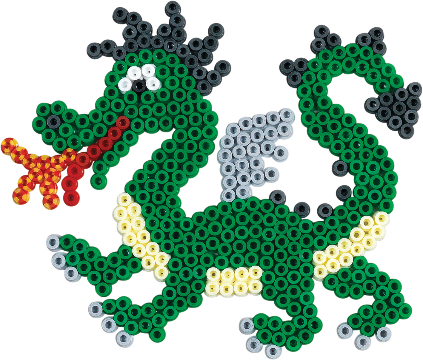 Env. 7.200 perles, 2 plaques: dragon réf. 305 et moyenne hexagonale réf. 329. 2 double plaques: ronde réf. 6503-49 et ellipse réf. 6504-49. 6 supports pour motifs réalisés, 1 stylo à presser, 1 fil, feuille de modèles en couleur, instructions, papier à repasser et 1 boîte à casiers avec couvercle.