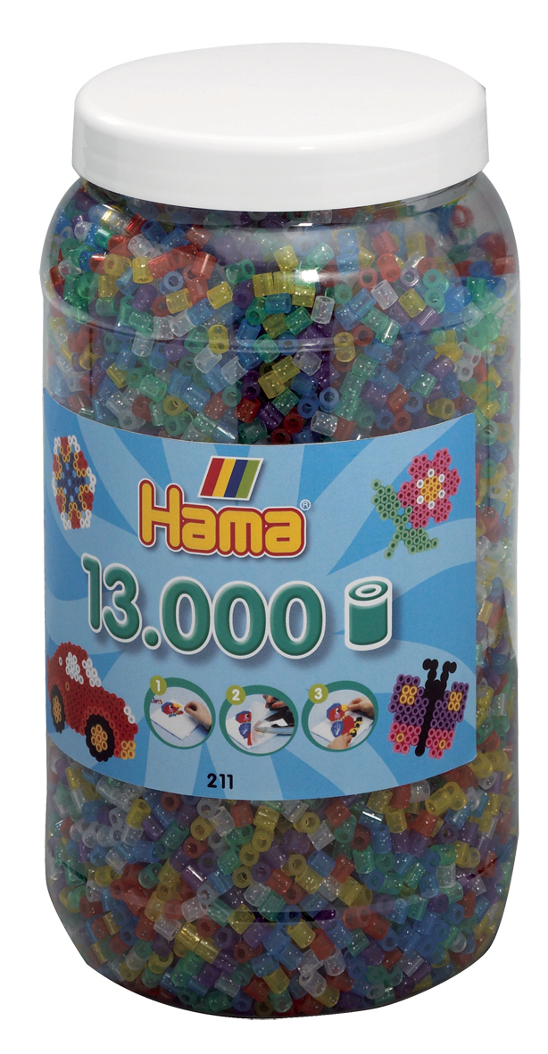 Retrouve dans ce pot un mélange de plus de 13 000 perles à paillettes Midi HAMA. Tout ce qu’il faut pour compléter tes créations ! (Mélange 54 - Les couleurs 13, 14, 15, 16, 19, 24 pailletés.) Pour jouer, rien de plus simple : 1) Poser les perles sur la plaque. 2) Couvrir le motif avec le papier à repasser puis repasser au fer très chaud sans vapeur. Le repassage est laissé aux soins des adultes. 3) Enlever le motif obtenu de la plaque de base qui est réutilisable. Les jeux Hama sont pensés pour le développement intellectuel et moteur des enfants. Au cours des premières années de vie, les petits apprennent à reconnaître les couleurs, à saisir les objets, à distinguer les formes, à avoir une première idée des quantités, etc. C’est en relation avec ces années d’apprentissage que les produits Hama montrent leur force en tant que jouets pédagogiques. Guidés par leurs parents, les enfants s’amuseront à prendre confiance en eux. Des activités qui développent le partage, la dextérité et qui stimulent la curiosité ! Adapté pour les enfants de plus de 5 ans.