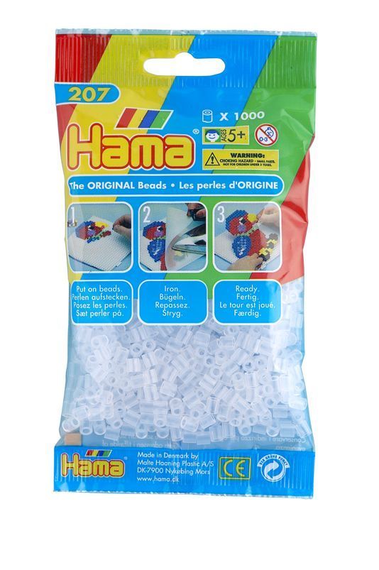Plus besoin de trier les perles ! Retrouve dans ce sachet plus de 1000 perles midi HAMA transparentes pour compléter tes créations. Pour jouer, rien de plus simple : 1) Poser les perles sur la plaque. 2) Couvrir le motif avec le papier à repasser puis repasser au fer très chaud sans vapeur. Le repassage est laissé aux soins des adultes. 3) Enlever le motif obtenu de la plaque de base qui est réutilisable. Les jeux Hama sont pensés pour le développement intellectuel et moteur des enfants. Au cours des premières années de vie, les petits apprennent à reconnaître les couleurs, à saisir les objets, à distinguer les formes, à avoir une première idée des quantités, etc. C’est en relation avec ces années d’apprentissage que les produits Hama montrent leur force en tant que jouets pédagogiques. Guidés par leurs parents, les enfants s’amuseront à prendre confiance en eux. Des activités qui développent le partage, la dextérité et qui stimulent la curiosité ! Adapté pour les enfants de plus de 5 ans.