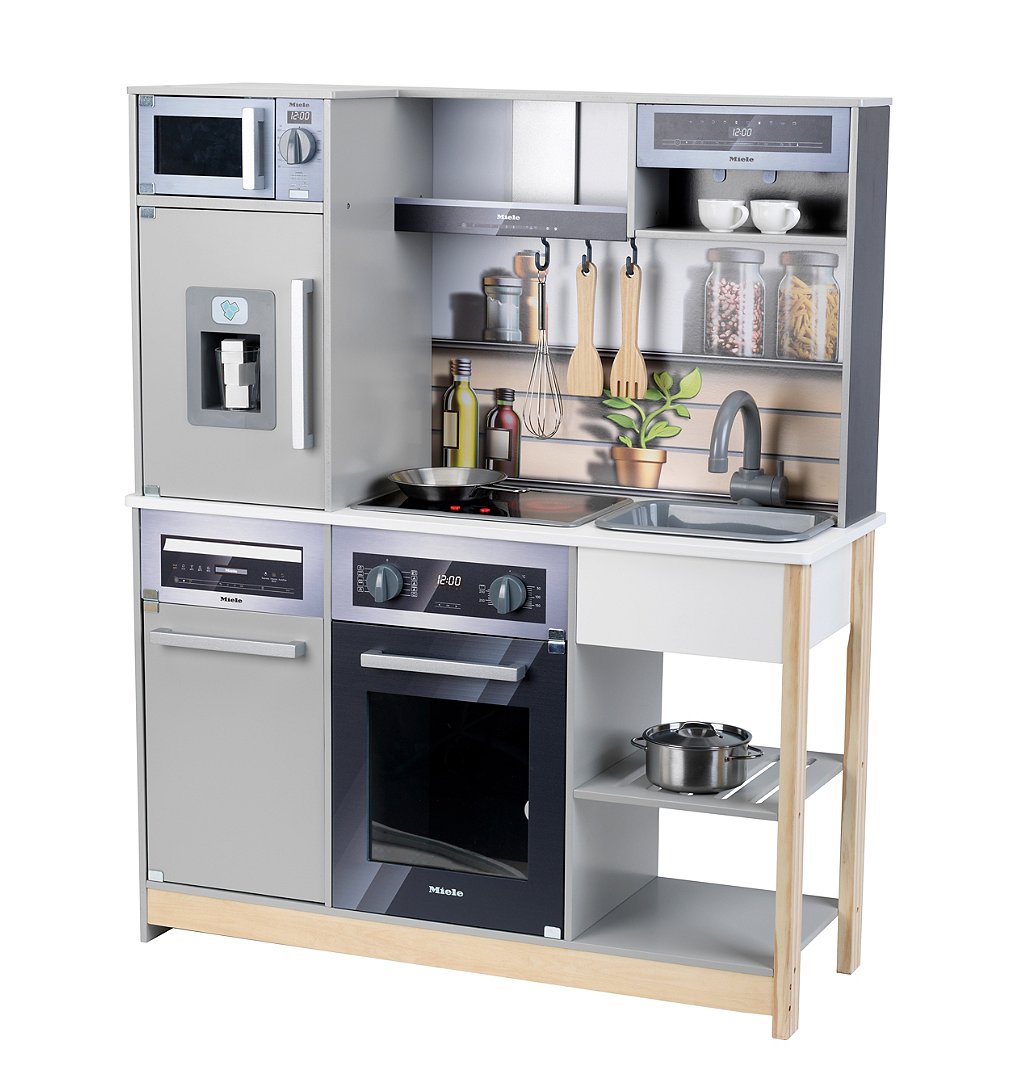 Cette très belle cuisine en bois MDF sous licence MIELE dispose d'un équipement complet et de qualité : plaque de cuisson avec fonction sonore et lumineuse, four, micro-ondes, lave vaisselle, frigo avec distributeur de glaçons, machine à café, évier avec robinet, rail de suspension avec crochets pour suspendre les ustensiles de cuisine, étagères de rangement. Nombreux accessoires en métal: casserole avec couvercle, poêle, fouet et spatules en bois. Dimensions produit monté :83,5 x 30 x 101 cm. FSC certified. A partir de 3 ans.