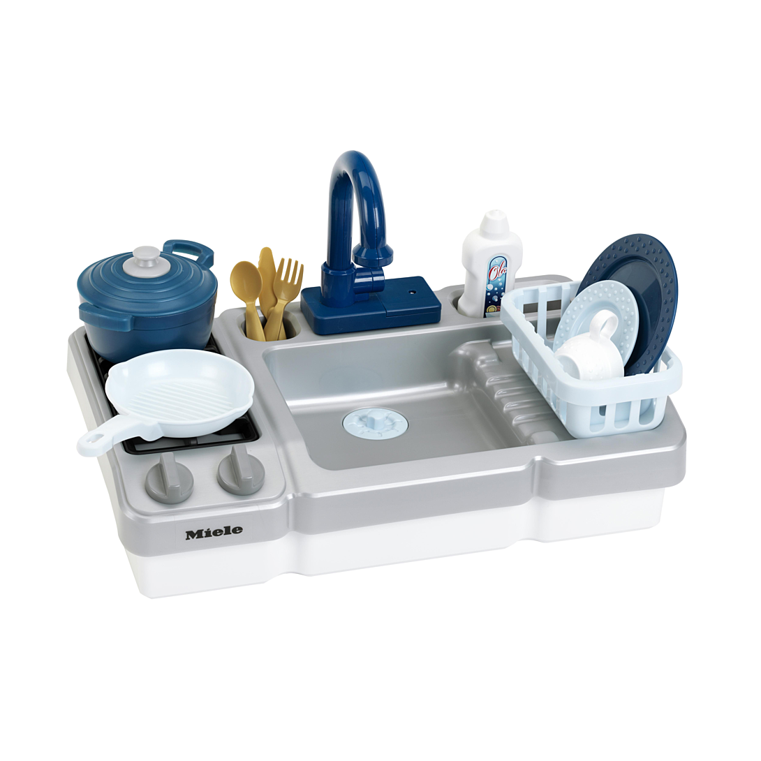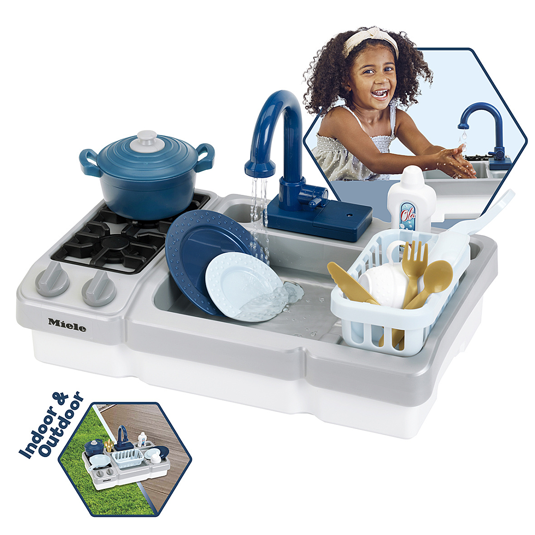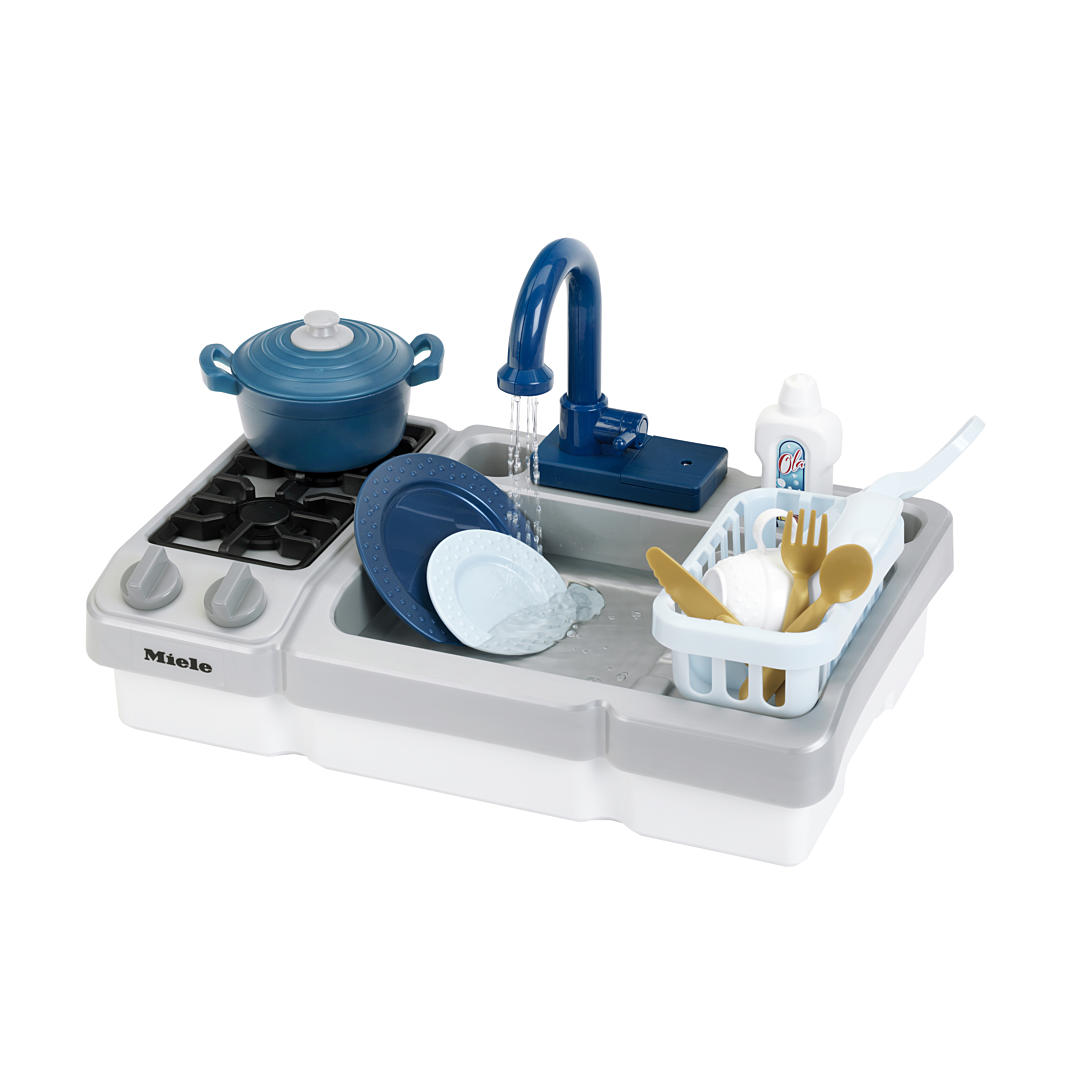L'évier de cuisine sous licence MIELE est composé d'un évier avec robinet fonctionnel (circuit d’eau), d'un égouttoir et d'un espace de cuisson à deux feux avec deux boutons de réglage factices. Il est livré avec de nombreux accessoires :un égouttoir, une cocotte avec couvercle, une poêle, un jeu de couverts (couteau, fourchette et cuillère), une grande et une petite assiette, une tasse, un panier égouttoir, etc… A partir de 3 ans. Fabriqué en Allemagne Couleurs et design ultra-modernes. Plastique de grande qualité, très résistant. Dimensions hors emballage : 42 x 26 x 26 cm. A partir de 3 ans. Fabriqué en Allemagne