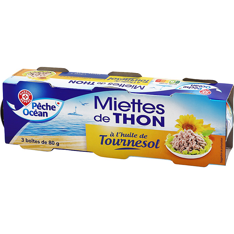 | Origine des principaux ingrédients | TOURNESOL ORIGINE : EUROPE, THON PECHE EN : OCEAN ATLANTIQUE CENTRE-EST, ATLANTIQUE CENTRE-OUEST, ATLANTIQUE SUD-EST, ATLANTIQUE SUD-OUEST, INDIEN EST, INDIEN OUEST, PACIFIQUE CENTRE-EST, PACIFIQUE CENTRE-OUEST, PACIFIQUE SUD-EST ET/OU PACIFIQUE SUD-OUEST*, THON PECHE EN : OCEAN ATLANTIQUE CENTRE-EST, ATLANTIQUE CENTRE-OUEST, ATLANTIQUE SUD-EST, ATLANTIQUE SUD-OUEST, INDIEN EST, INDIEN OUEST, PACIFIQUE CENTRE-EST, PACIFIQUE CENTRE-OUEST, PACIFIQUE SUD-EST ET/OU PACIFIQUE SUD-OUEST*, TOURNESOL ORIGINE : EUROPE * SELON LES APPROVISIONNEMENTS ET/OU LES CARACTÉRISTIQUES GUSTATIVES RECHERCHÉES |