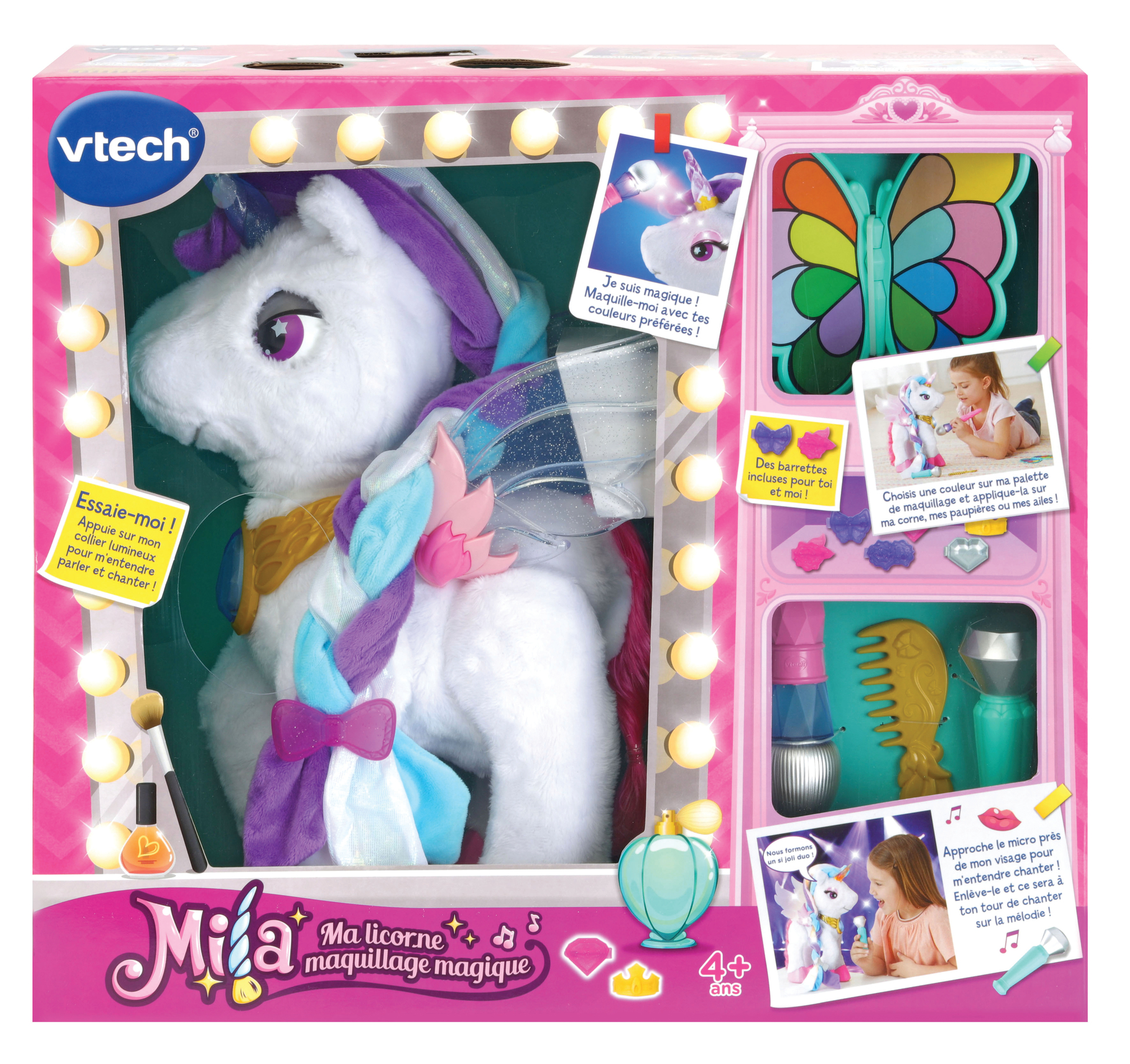 Mila est une licorne parlante et interactive à personnaliser en changeant ses couleurs grâce au pinceau magique. Elle chante, bouge la tête et interagit avec la petite fille.
