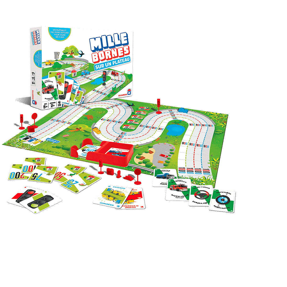 | Plus produit | - Le plateau permet de visualiser l\'avancée des voitures. Et aide supplémentaire pour les plus jeunes : chaque carte associée à un animal (escargot pour 25 kilomètres, hirondelle pour les 200 kilomètres...) permet à l\'enfant d\'associer visuellement l\'animal à la distance et de compter non plus de 25 à 200 mais de 1 à 8 (les cases représentent 25 kilomètres).\n- Beaucoup plus simple mais toujours aussi fun ! |