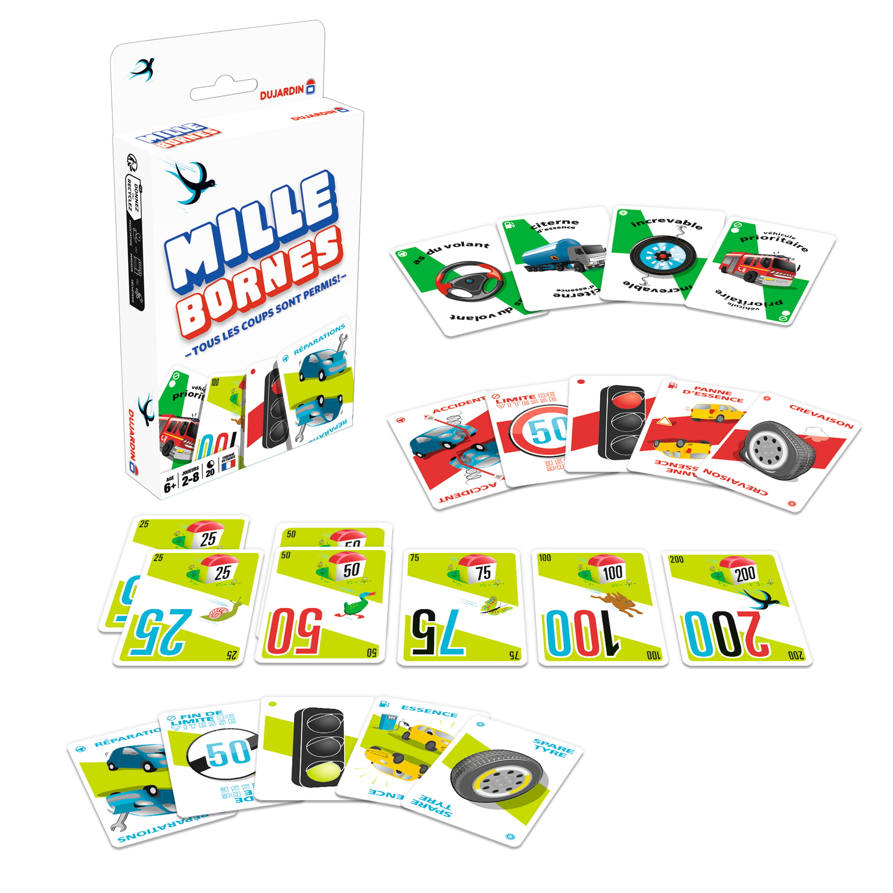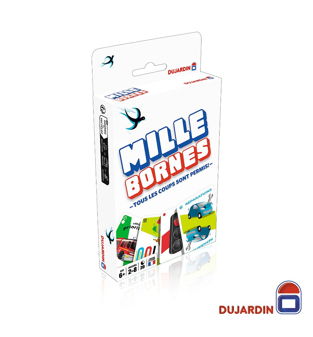 Atteignez les 1000 Bornes en premier en déjouant les attaques de vos adversaires. Quelques nouvelles règles viennent pimenter vos parties : piocher dans la défausse, répliquer immédiatement à une attaque ou voler des cartes aux autres joueurs. Une partie dynamique et pleine de rebondissements !
