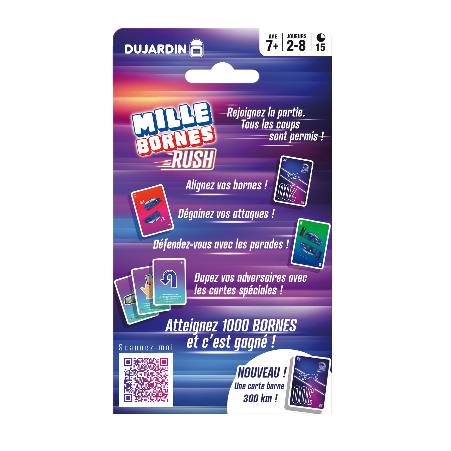 Atteignez les 1000 Bornes en premier en déjouant les attaques de vos adversaires. Quelques nouvelles règles viennent pimenter vos parties : piocher dans la défausse, répliquer immédiatement à une attaque ou voler des cartes aux autres joueurs. Une partie dynamique et pleine de rebondissements !