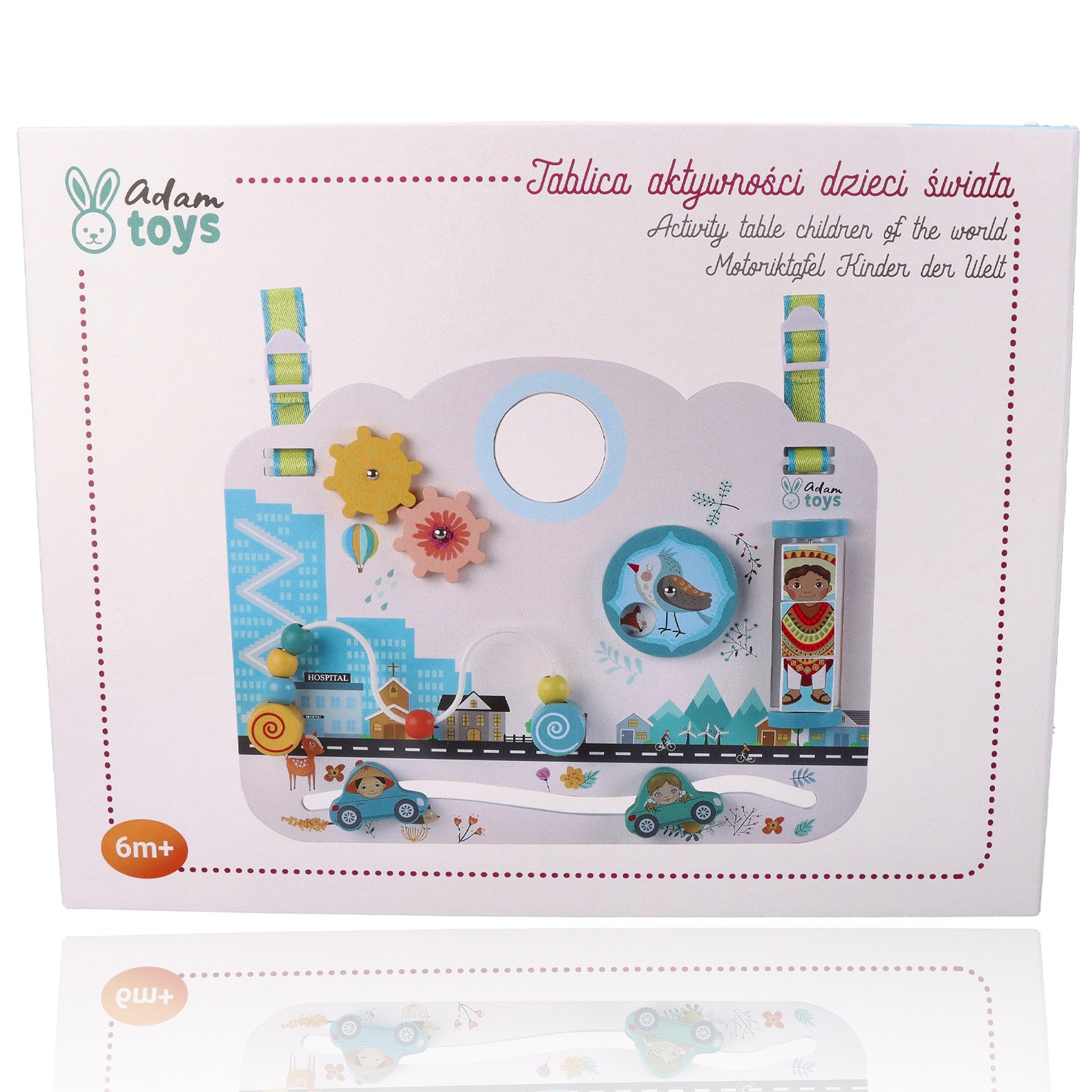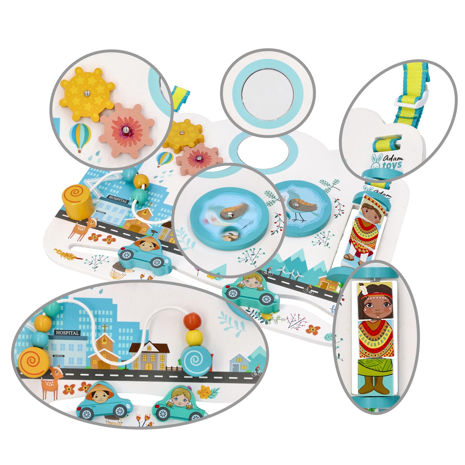 Votre bébé pourra jouer avec 2 engrenages qui tournent l'un au contact de l'autre, 1 roue pour découvrir des animaux, des perles à déplacer, 1 miroir et 2 petites voitures qui coulissent. De plus, 1 puzzle rotatif en 3 parties ravira votre enfant, qui découvrira des enfants du monde avec différentes cultures et vêtements !