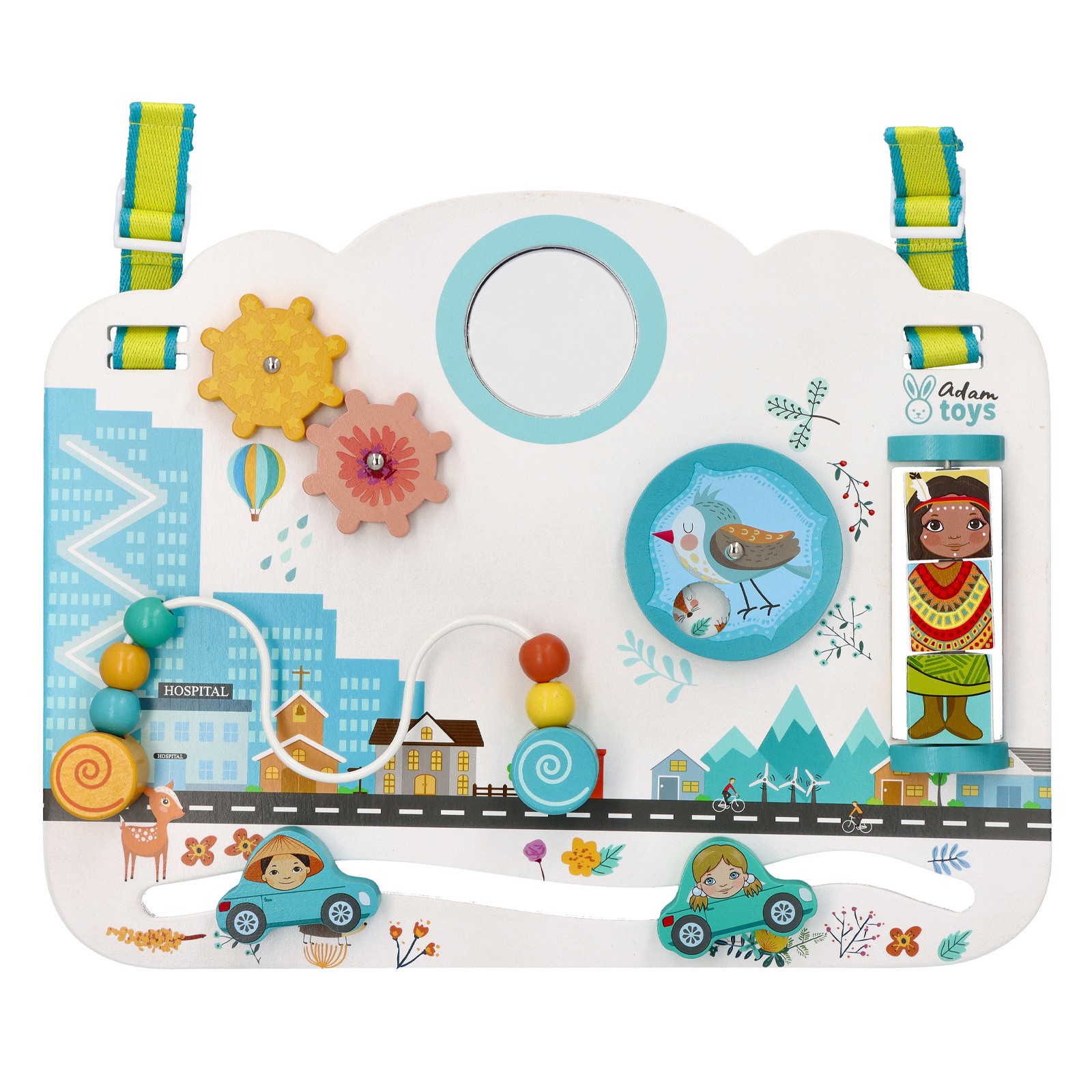 Ce busy board peut s'accrocher au lit de bébé grâce à 2 sangles ou se poser à plat.