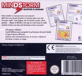 Avec Mindstorm sur DS, faites travailler vos neurones tout en vous amusant grâce à une série d'exercices. Entraînez-vous sur des suites logiques, des jeux de mémoire, des puzzles, des quiz de culture générale... Vous trouverez dans la cartouche pas moins de cent énigmes à débloquer, une quinzaine d'épreuves différentes et une difficulté qui s'adapte à votre âge.
