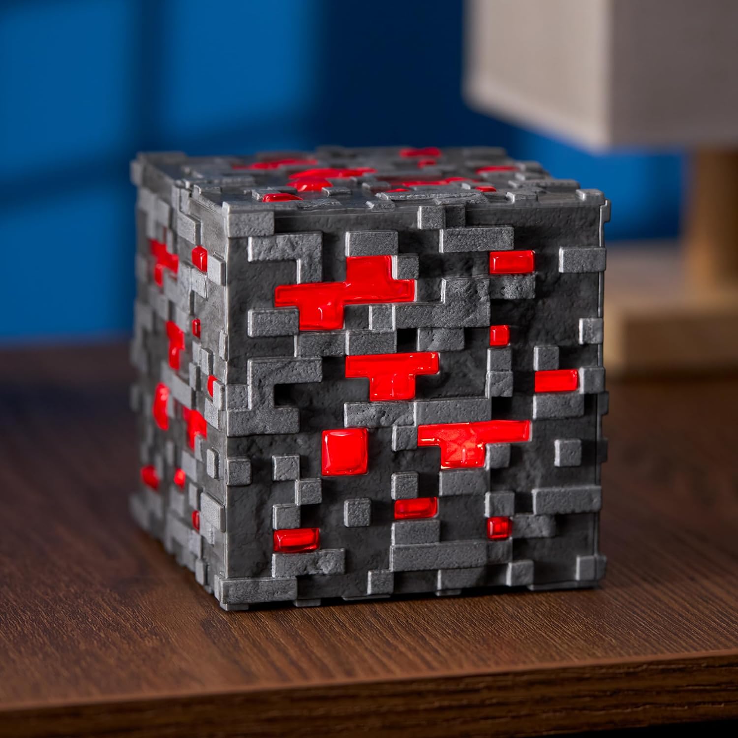 Ce produit est une réplique fidèle du minerai de redstone, un élément essentiel du jeu vidéo Minecraft. Il s'illumine en rouge lorsque vous le touchez, créant une ambiance magique et mystérieuse. Il est fabriqué en PVC et mesure 10 cm de côté. Il fonctionne avec trois piles AAA 1.5V non incluses. C'est un cadeau idéal pour les fans de Minecraft, petits et grands.