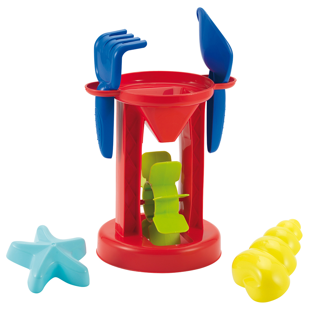 Un moulin à sable et à eau garni d'une pelle , d'un râteau et de 2 moules à sable. Conseillé dès 18 mois. Origine France Garantie.
