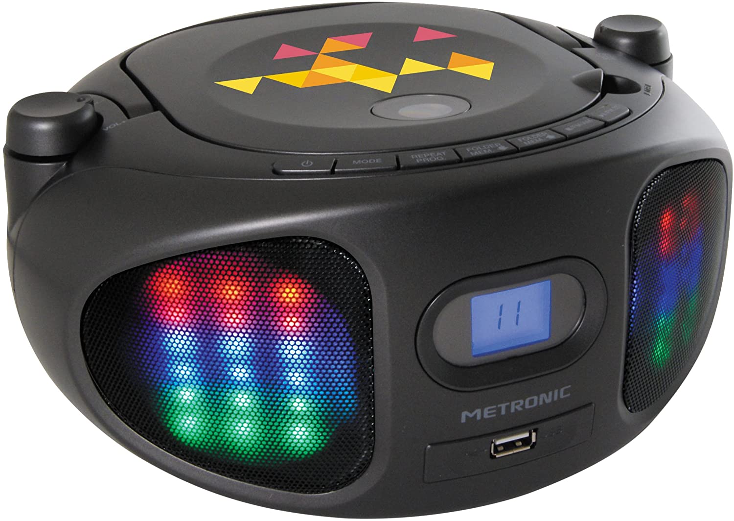 Metronic propose un design unique pour ses boomboxes, qui s’intègre aussi bien dans une chambre d’enfant que dans un salon ou encore dans une cuisine.La boombox Metronic est aussi mobile, grâce à sa poignée ergonomique et son fonctionnement sur pile (elle fonctionne aussi sur secteur), des atouts pour l’emmener partout !Grâce à ses nombreuses LED et à ses thèmes lumineux pré-programmés, le radio CD Lumi vous emmène dans un monde de lumières rythmées.La boombox Metronic est compatible avec la quasi-totalité des disques disponibles sur le marché.Notre système audio vous permet d'écouter de la musique encodée en MP3 sur des CD, CD-R et CD-RW.Les CD-R sont enregistrables une fois et peuvent être lus sur n'importe quel lecteur de CD tandis que les CD-RW peuvent être réenregistrés plusieurs fois et lus sur la totalité des boombox Metronic .Faites-vous plaisir, écoutez vos musiques dans l’ordre que vous le souhaitez.Après avoir chargé vos chansons préférées via la prise USB ou via la carte SD, tout ce qu'il vous reste à faire et de sélectionner l'un des modes, lecture normal, aléatoire, répétition, ou prog afin que les pistes soient lues dans des modes différents.Les boomboxes Jungle & Circus disposent d'une sortie casque qui vous permettront d'écouter votre musique préférée sans gêner vos voisins.