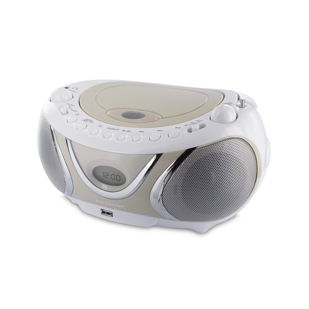 Metronic propose un design unique pour ses boombox, qui s’intègre aussi bien dans une chambre d’enfant que dans un salon ou encore dans une cuisine.La boombox Metronic est aussi mobile, grâce à sa poignée ergonomique et son fonctionnement sur pile (elle fonctionne aussi sur secteur), des atouts pour l’emmener partout !La boombox Metronic est compatible avec la quasi-totalité des disques disponibles sur le marché.Notre système audio vous permet d'écouter de la musique encodée en MP3 sur des CD, CD-R et CD-RW.Les CD-R sont enregistrables une fois et peuvent être lus sur n'importe quel lecteur de CD tandis que les CD-RW peuvent être réenregistrés plusieurs fois et lus sur la totalité des boombox Metronic .Faites-vous plaisir, écoutez vos musiques dans l’ordre que vous le souhaitez.Après avoir chargé vos chansons préférées via le lecteur CD ou la prise USB, tout ce qu'il vous reste à faire et de sélectionner l'un des modes, lecture normal, aléatoire, répétition, prog ou intro afin que les pistes soient lues dans des modes différents.Cette fonctionnalité de programmation de la lecture de CD MP3 vous permet d'écouter vos musiques préférées dans l'ordre que vous souhaitez avec un maximum de 99 musiques.Grace à l’ID3-Tag, nos boombox peuvent afficher le nom de l'artiste et le titre de la chanson jouée afin d'identifier facilement vos musiques.Des informations numériques et textuelles apparaissent pour pouvoir facilement visualiser le nom de l'artiste et le titre de la chanson.La compatibilité ID3-Tag vous permet une identification et une recherche facile des nombreuses pistes sur votre CD MP3.