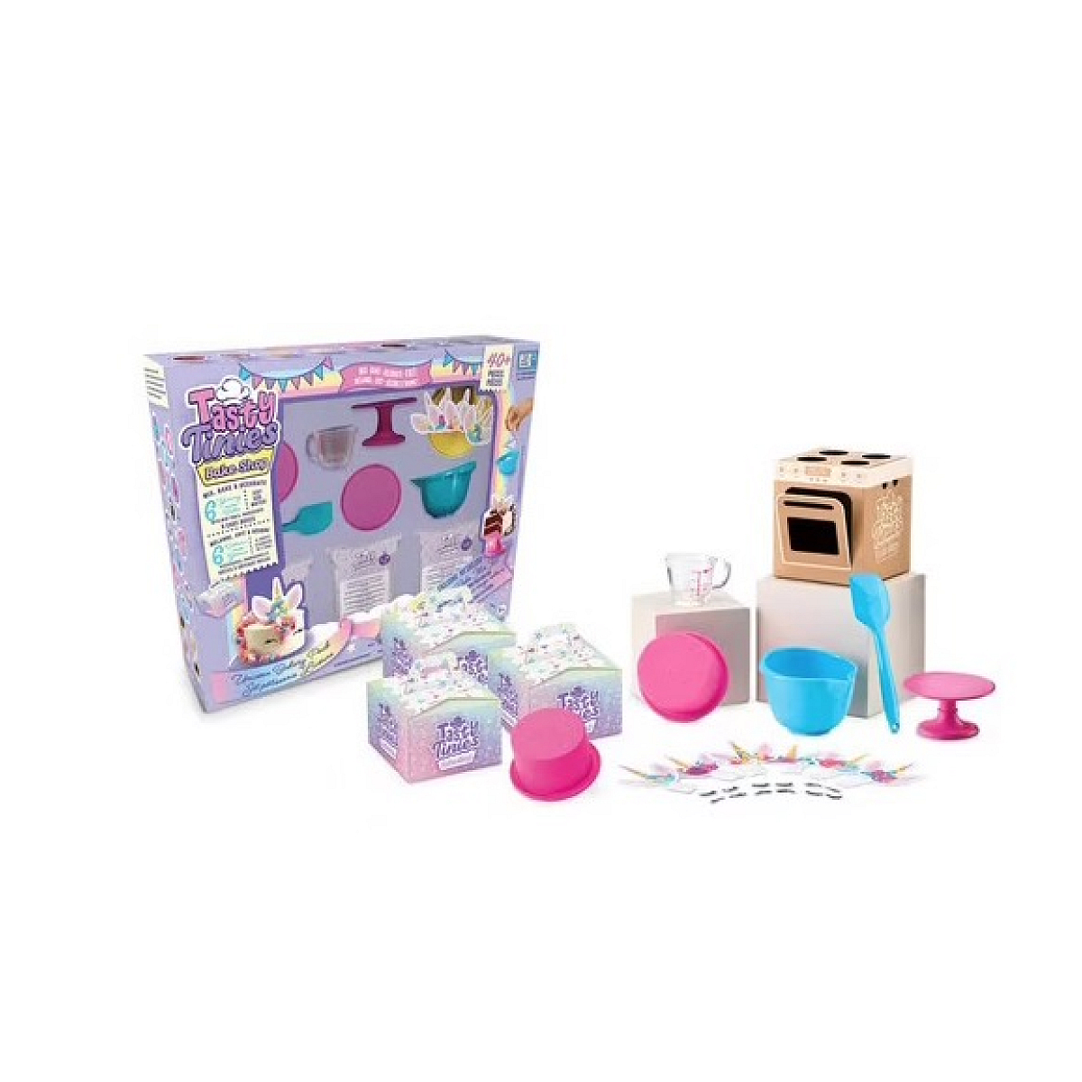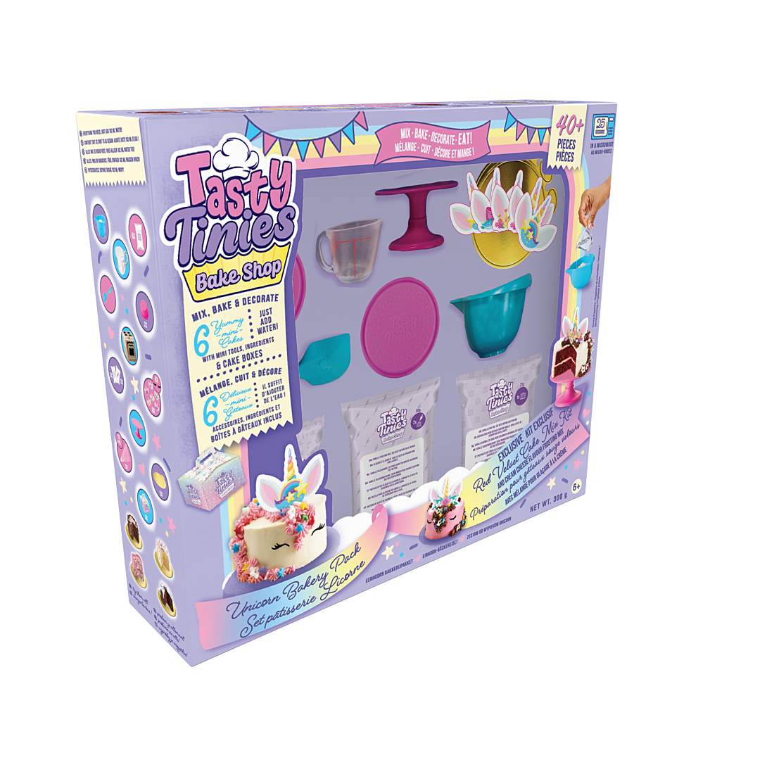 Chaque kit comprend des sachets d'ingrédients pré-dosés, un récipient de cuisson allant au micro-ondes et un moule à gâteau en silicone de qualité alimentaire. Ingrédients et matériaux non toxiques Sans BPA, polycarbonates, PVC et phtalates. Fabriqué à partir de matériaux approuvés par la FDA, de qualité alimentaire Composition du kit : 6 x préparations pour gâteaux (1 Vanille/ 1 Fraise/ 2 Chocolat) 3 x sachets de décoration 3 x tubes de glaçage 1 x four à cuisson rapide 3 x moules en silicone 1 x pointe à douille 2 x poches à douille 1 x mini spatule 1 x mini bol 1 x bol mesureur 1 x pipette 6 x décorations Licorne 1 x présentoir à gâteaux Dès 6 ans.