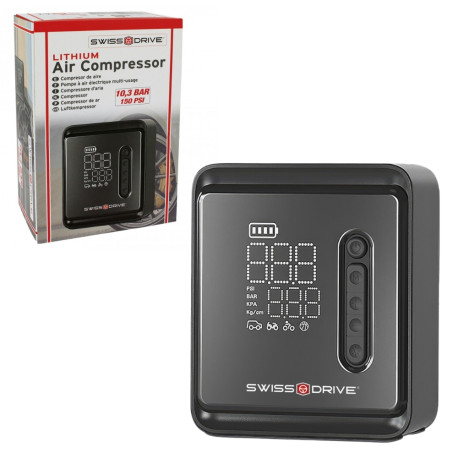 Mini Compresseur Portable Swiss Drive 150 PSI – Recharge USB, Arrêt Auto & Écran Digital. Adaptateur incl