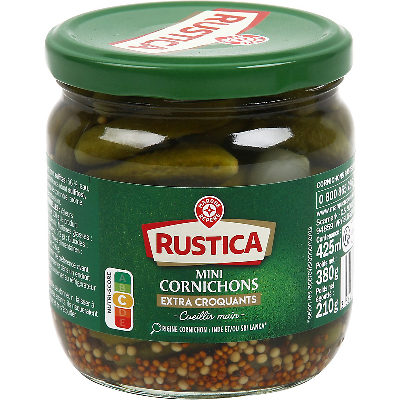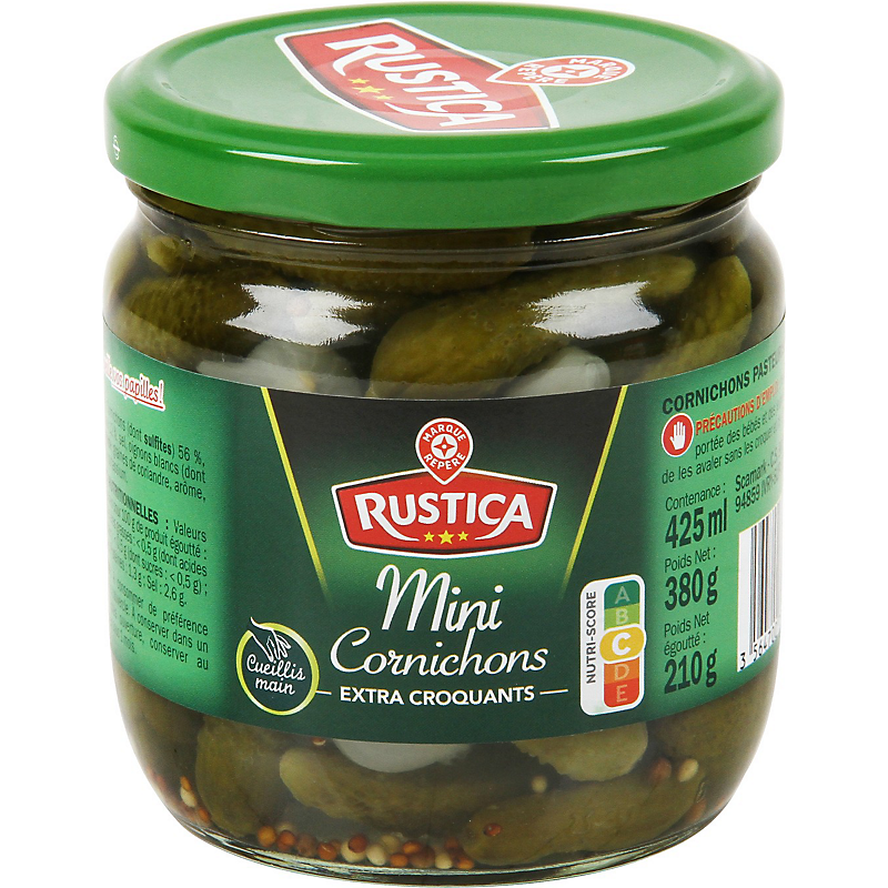 Ingrédients: Cornichons (dont sulfites) 56 %, eau, vinaigre d'alcool, sel, oignons blancs (dont sulfites), graines de moutarde, graines de coriandre, arôme, conservateur : disulfite de potassium.