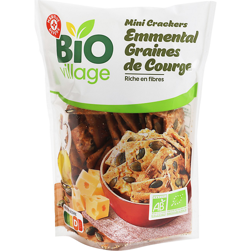 Biscuits salés croustillants à l'emmental, aux graines de courge et à l'huile d'olive vierge extra 6,2 % - produit issu de l'agriculture biologique BIO VILLAGE