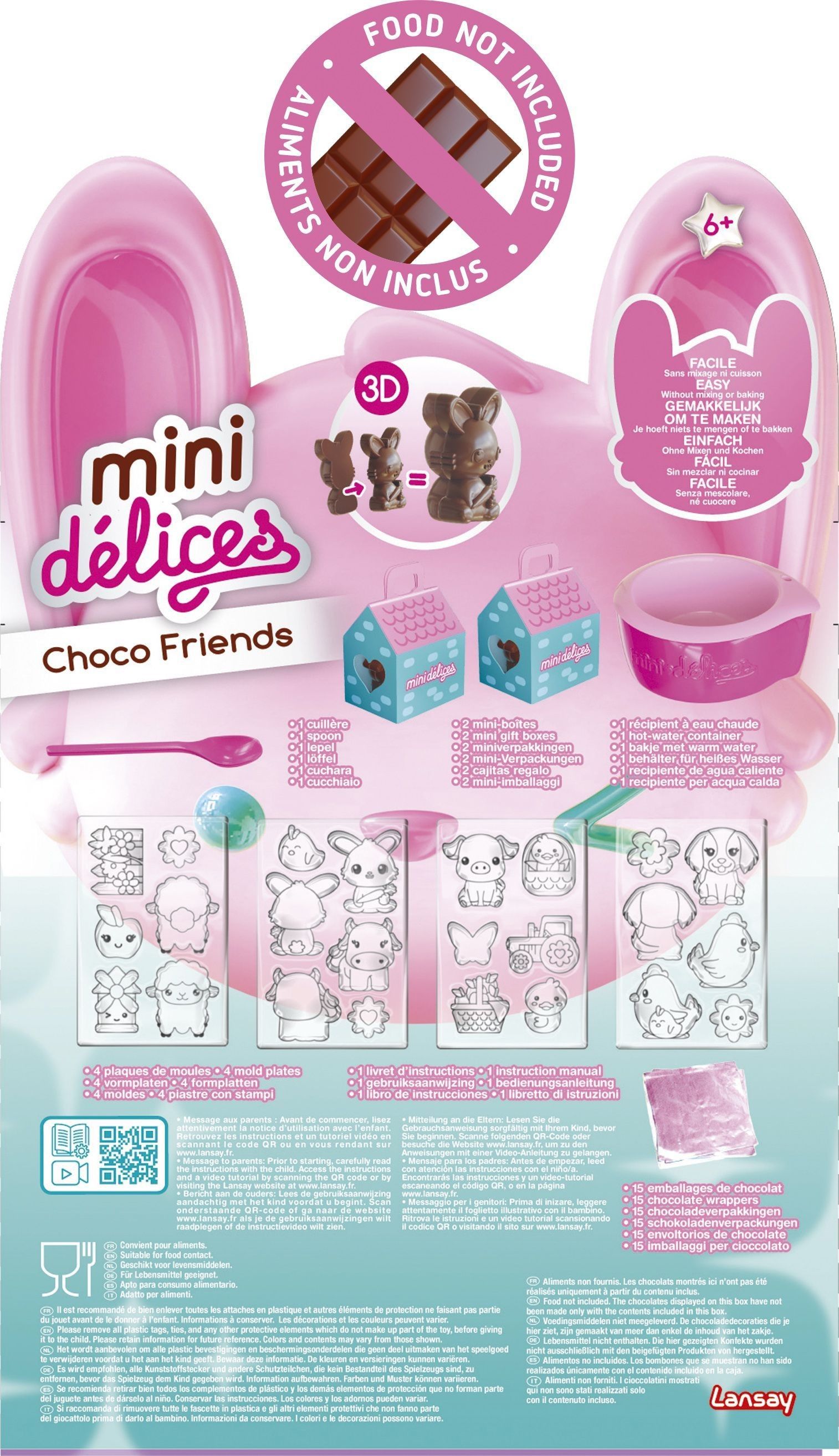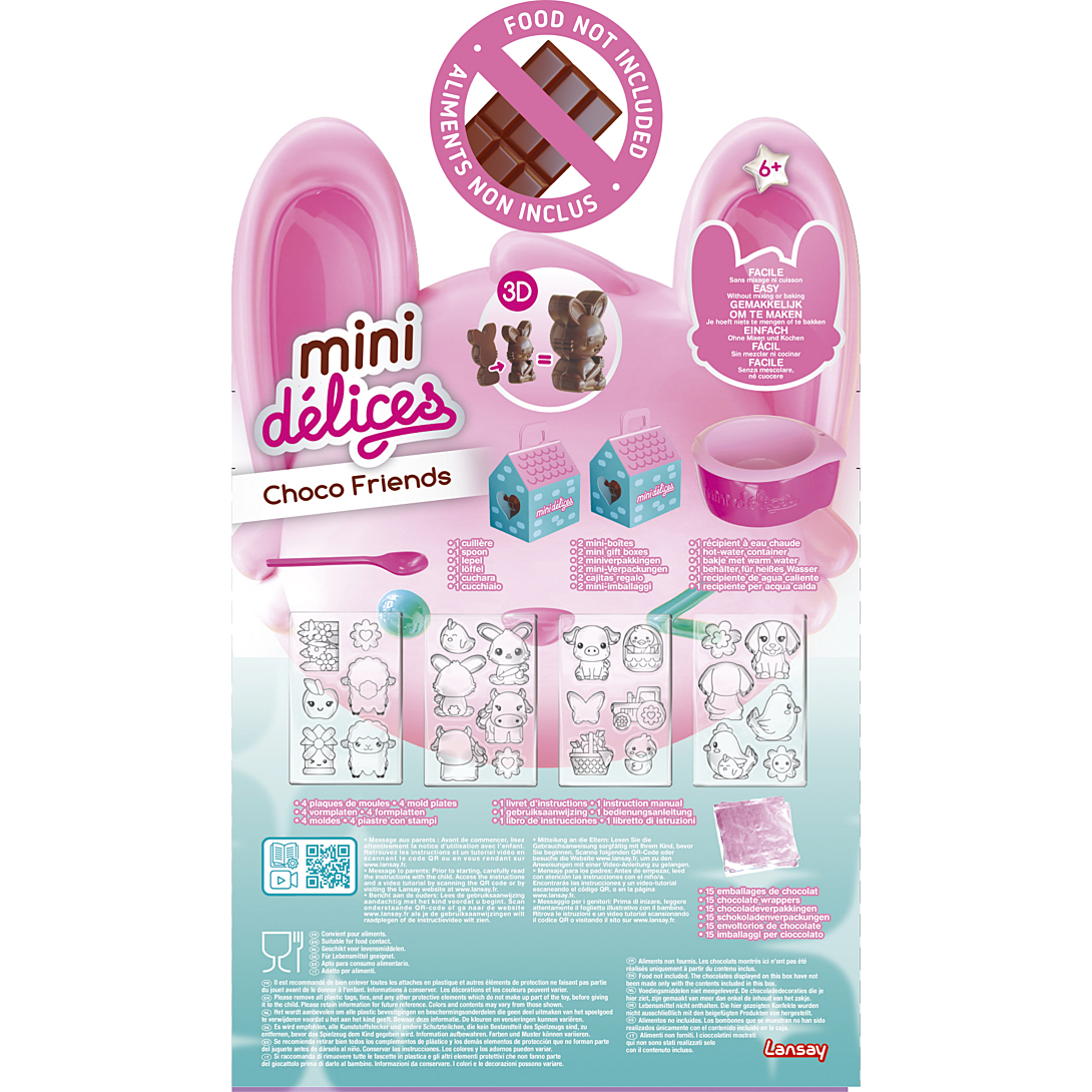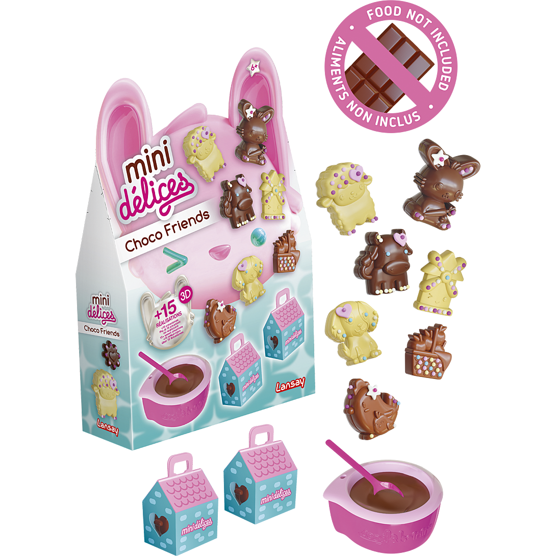 Découvre le coffret Choco Friends pour créer facilement de jolies petites sucettes ! Fais fondre des carrés de chocolat grâce au récipient à eau chaude, remplis tes moules de chocolat fondu à l’aide de la cuillère et mets-les au frigo ! Tu peux ensuite sublimer tes réalisations avec les décorations sucrées de ton choix (non incluses) ! Tu peux ensuite offrir tes chocolats dans les jolis emballages inclus !