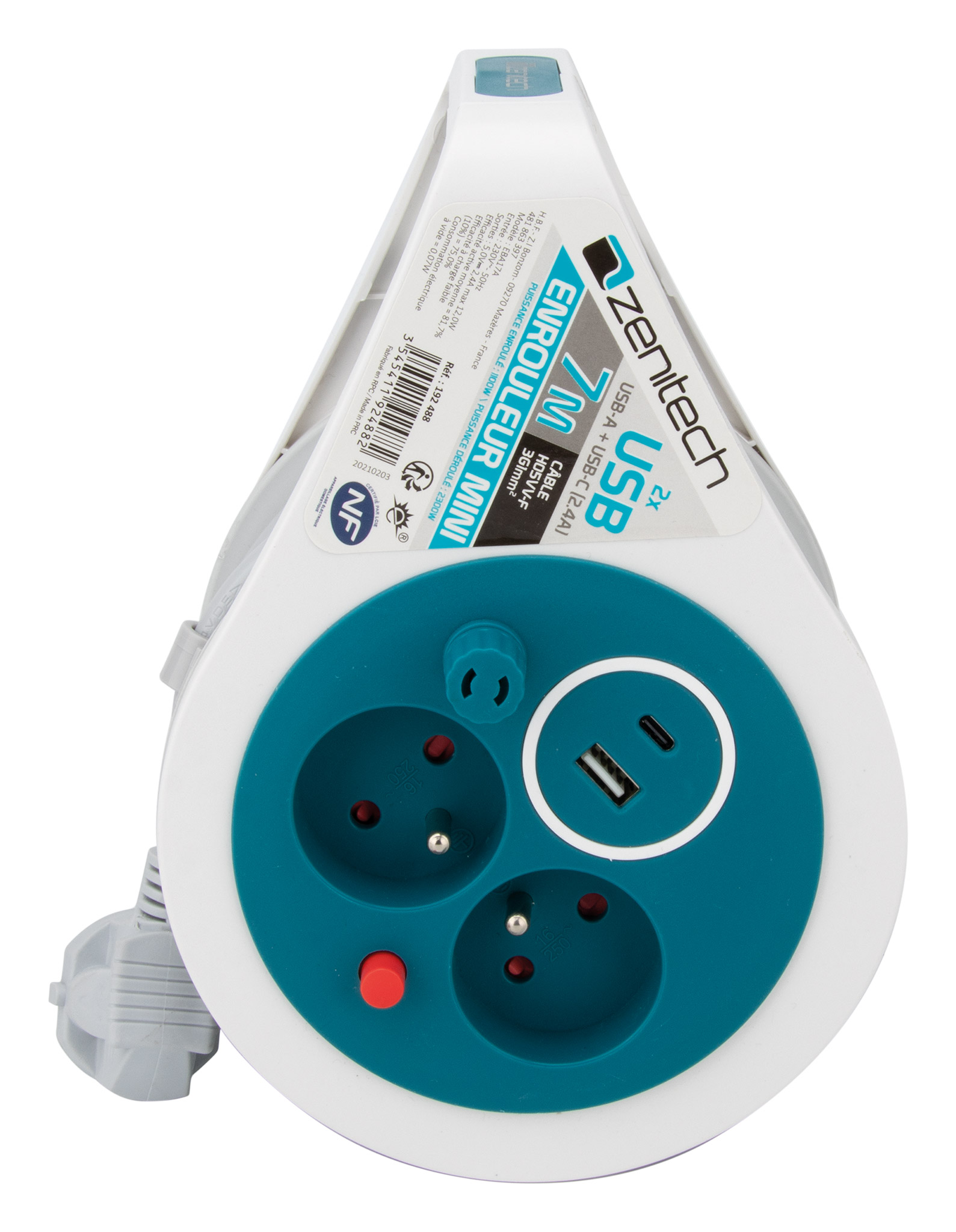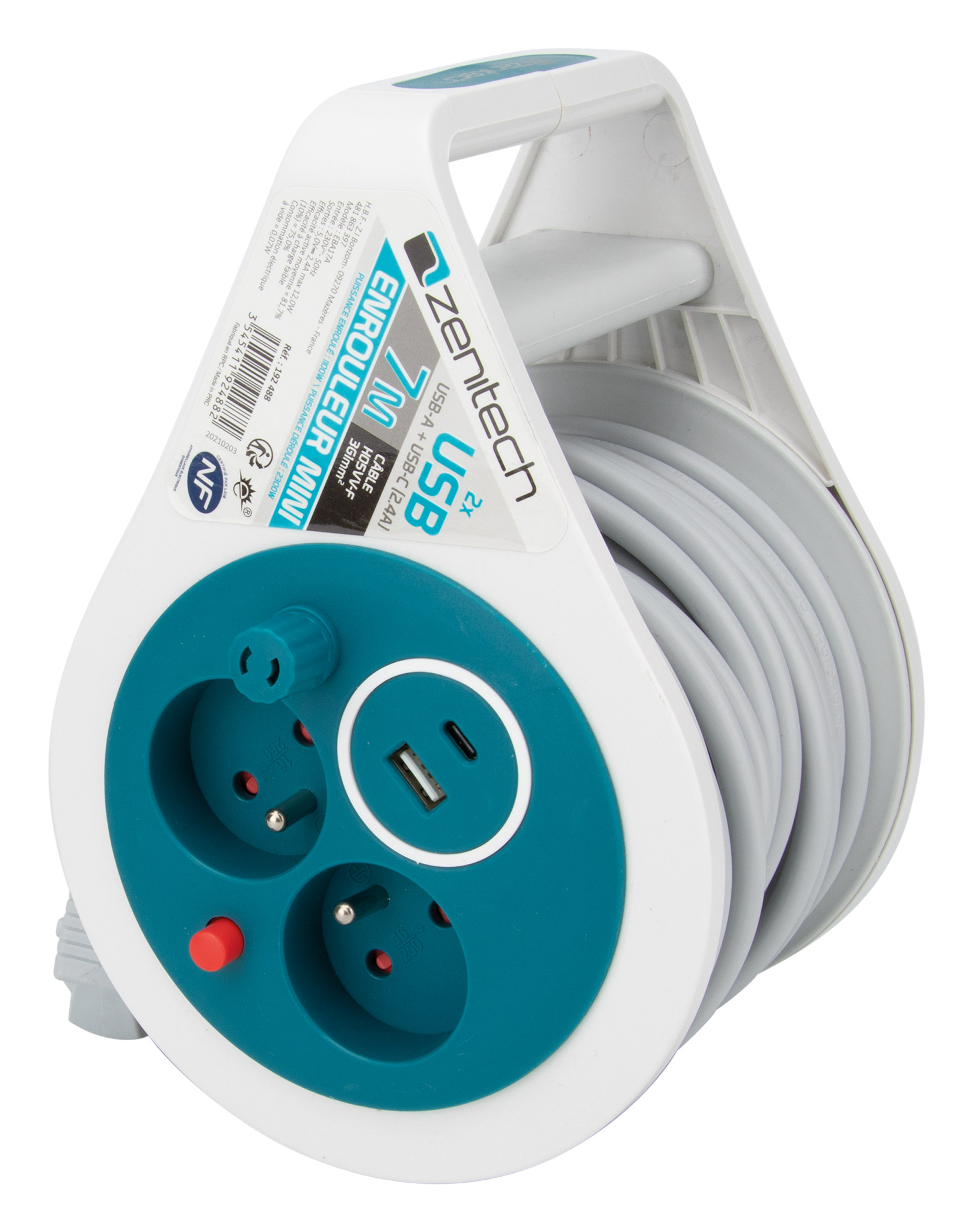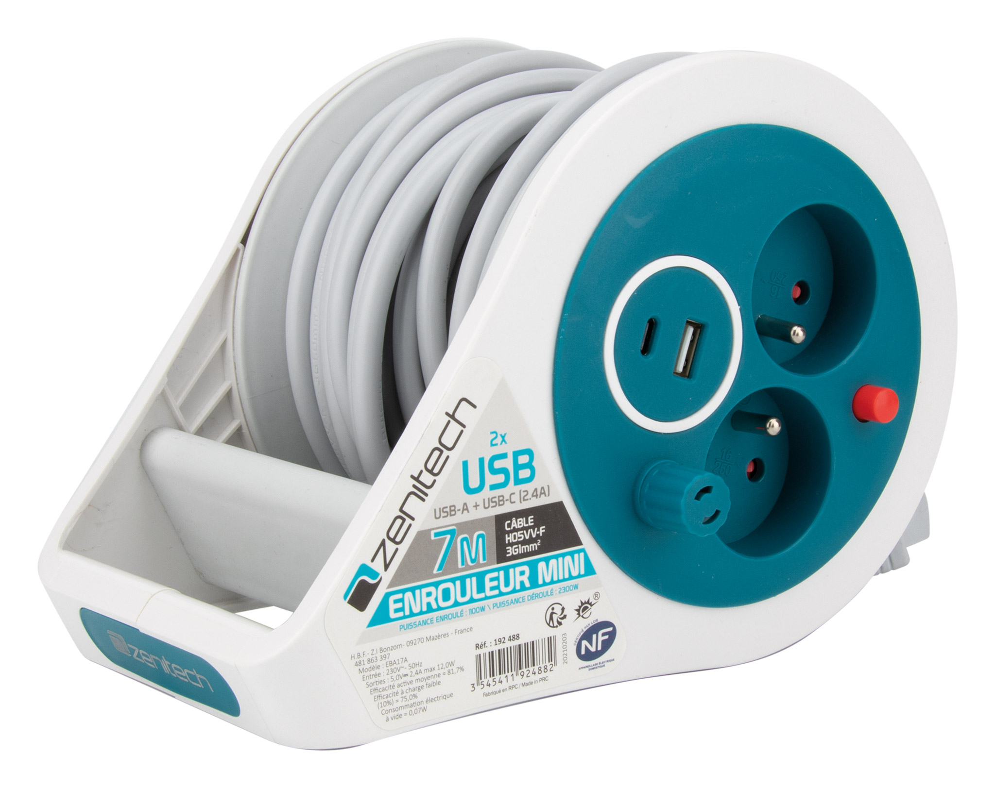 | Libellé | Mini enrouleur 2 prises P+T + 2 USB - 7m - Bleu - Zenitech |