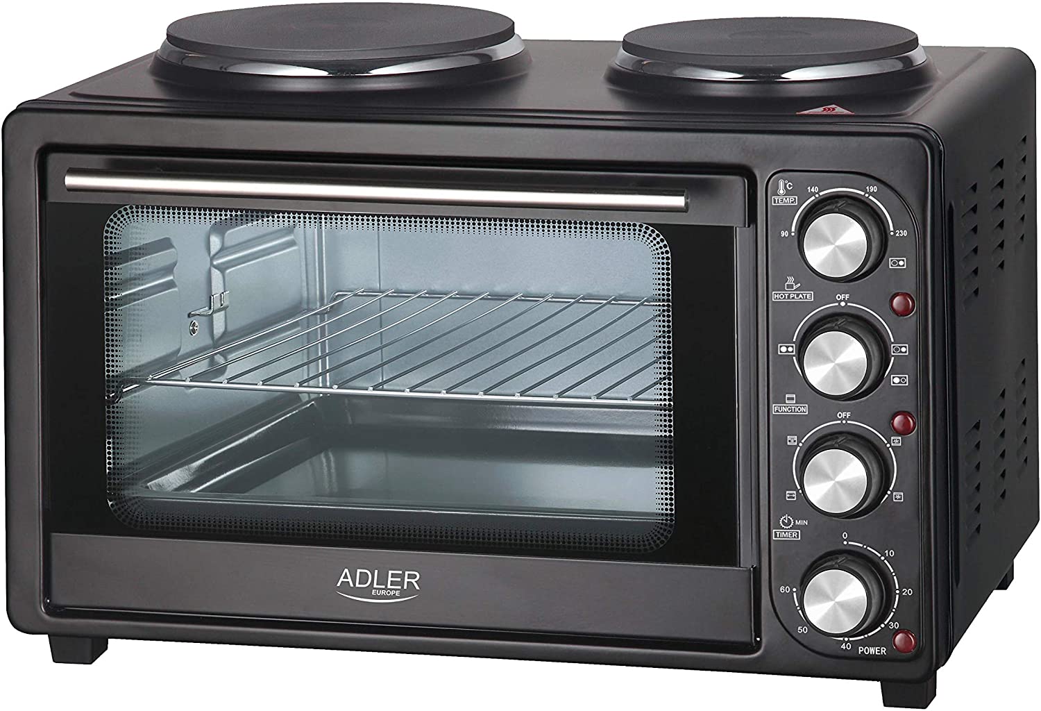 Four électrique de haute qualité avec deux plaques chauffantes réglables sur le dessus, avec rôtissoire avec une grille et une plaque de cuisson. Il permet de préparer des viandes rôties, de cuire des gâteaux et de préparer d'autres plats nécessitant des températures élevées. Le four permet de choisir le mode de chauffe : par le bas, par le haut ou à la fois par le bas et par le haut. Les éléments chauffants ont été fabriqués en acier inoxydable résistant, ce qui les rend durables et fiables. Grâce à une minuterie, l'utilisateur est informé lorsqu'un certain temps s'écoule. Il est donc beaucoup moins probable que vous brûliez votre plat. Le four électrique AD 6020 a une double plaque chauffante sur le dessus qui permet de préparer deux produits différents en même temps.spécification:Capacité : 36L.Diamètre des plaques chauffantes : 185 mm et 155 mm.Puissance maximale du four 2500W.Puissance nominale du four 1500W.Puissance maximale de la plaque chauffante de 155 mm de diamètre : 900W.Puissance nominale de la plaque chauffante de 155mm de diamètre : 700W.Puissance maximale de la plaque chauffante de 185 mm de diamètre : 1200W.Puissance nominale de la plaque chauffante de 185mm de diamètre : 1000W.Contrôle de la température de 90°C à 230°C.Éléments chauffants en acier inoxydable.Minuterie jusqu'à 60 minutes.four à chaleur tournante.Rôtissoire rotative.Arrêt automatique signalé par une cloche en fin de cuisson.dimensions extérieures : 55 x 36 x 36 cm.dimensions intérieures : 39 x 21 x 30 cm.l'ensemble comprend : grille, tournebroche, plateau, ramasse-miettes, poignée pour retirer la grille/le plateau.