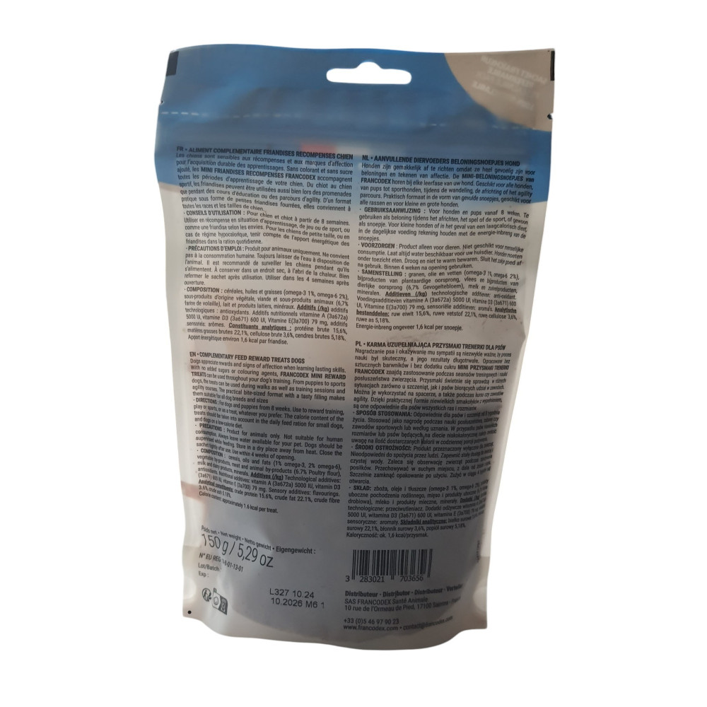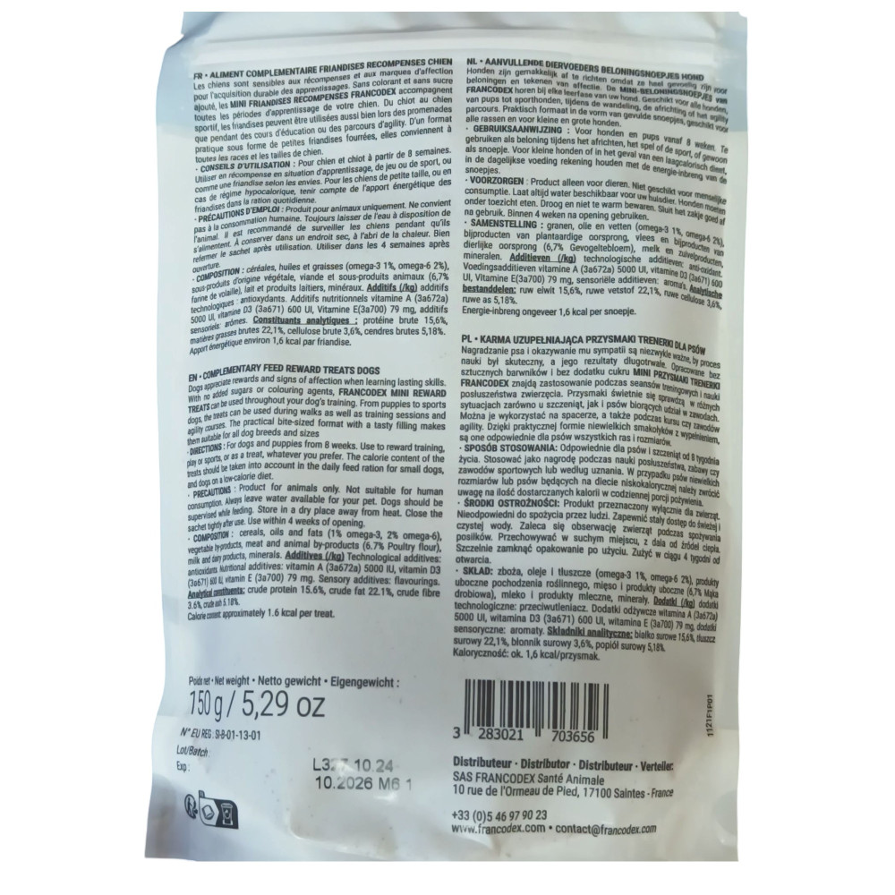 - Sans colorant et sans sucre ajouté, les MINI FRIANDISES RECOMPENSES FRANCODEX accompagnent les jeux et toutes les périodes d'éducation de votre chien, comme l'apprentissage des manipulations nécessaires aux soins, et l'entrainement médical.