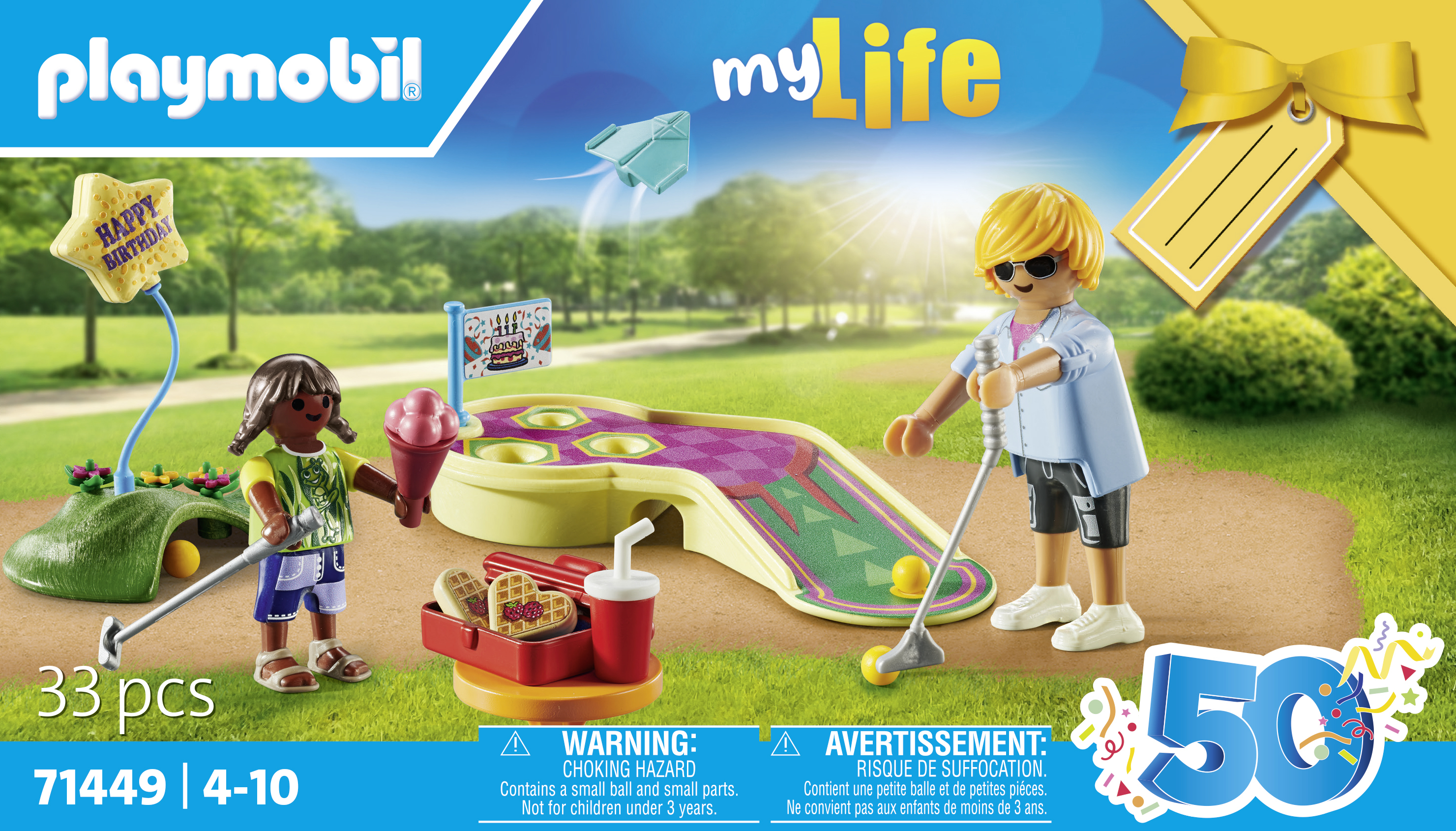 Découvrez le coffret PLAYMOBIL "Mini golf" ! Avec son père, la fillette fête son anniversaire en jouant au mini-golf. Il y a de délicieuses gaufres et de la glace à la fraise. Ce set comprend deux personnages PLAYMOBIL, un terrain de mini-golf, des clubs de golf, des balles et des accessoires. La partie avant du mini-golf permet de placer parfaitement la balle pour le départ, tandis qu'à l'étage supérieur, trois trous supplémentaires servent de cibles. Le passage sous le parcours peut servir de tunnel et la colline constitue un défi supplémentaire. Les clubs de golf, l'avion en papier, le cornet de glace, le gobelet à boisson et la ficelle à ballons sont dotés de poignées pratiques et peuvent être tenus par les deux personnages.