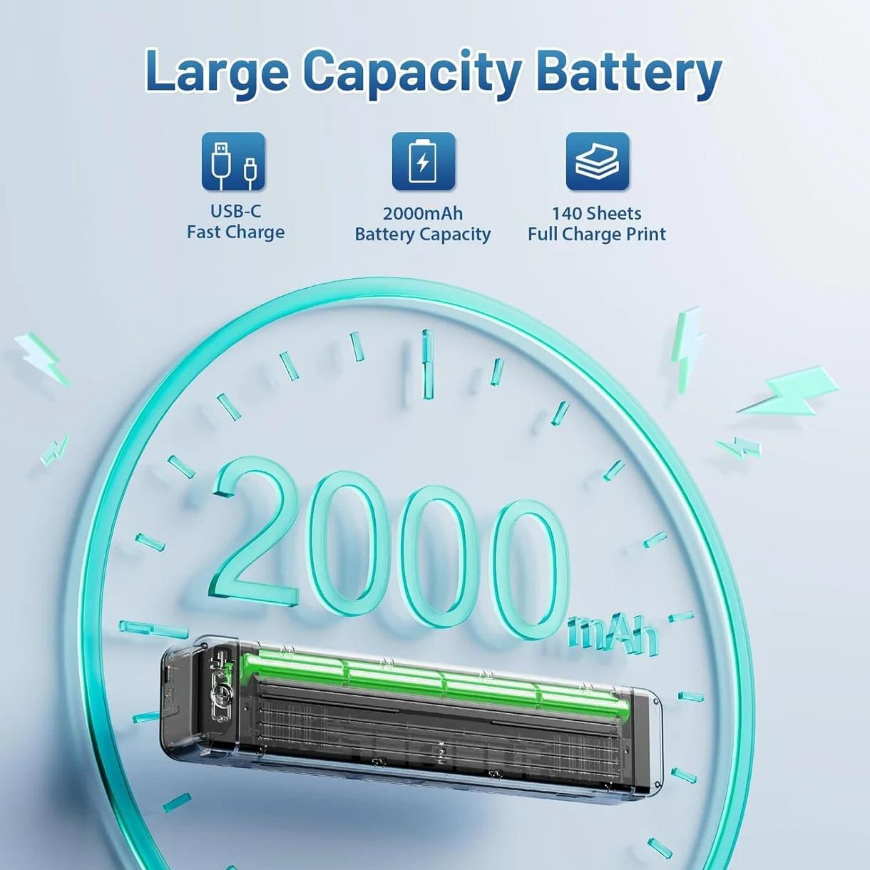 Avec une batterie rechargeable intégrée de 2000mAh, cette Mini Imprimante est facile à recharger via un port USB-C standard, vous n'avez même pas besoin de transporter un chargeur supplémentaire.