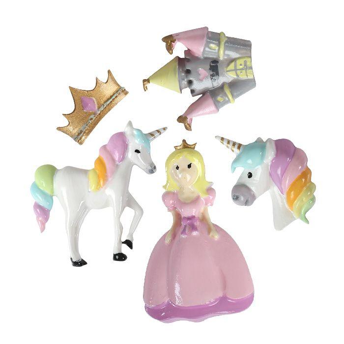 Moule en silicone pour réaliser 5 miniatures sur le thème des princessses et des licornes : couronne, licornes, princesse, château de princesse. Extra flexible, ce moule permet de démouler la pâte polymère, pour obtenir des motifs de haute précision. Il est idéal pour réaliser des miniatures décoratives, pour la carterie, les scrapbooking, la bijouterie. Il s'utilise avec de la pâte polymère (la cuisson est possible avec le moule), du plâtre, de la poudre céramique, de la résine ou encore de la pâte Oyumaru. Pour nettoyer votre moule en silicone, il vous suffit de le passer sous de l'eau savonneuse. Dimensions des miniatures : entre 1,5 et 2,5 cm.