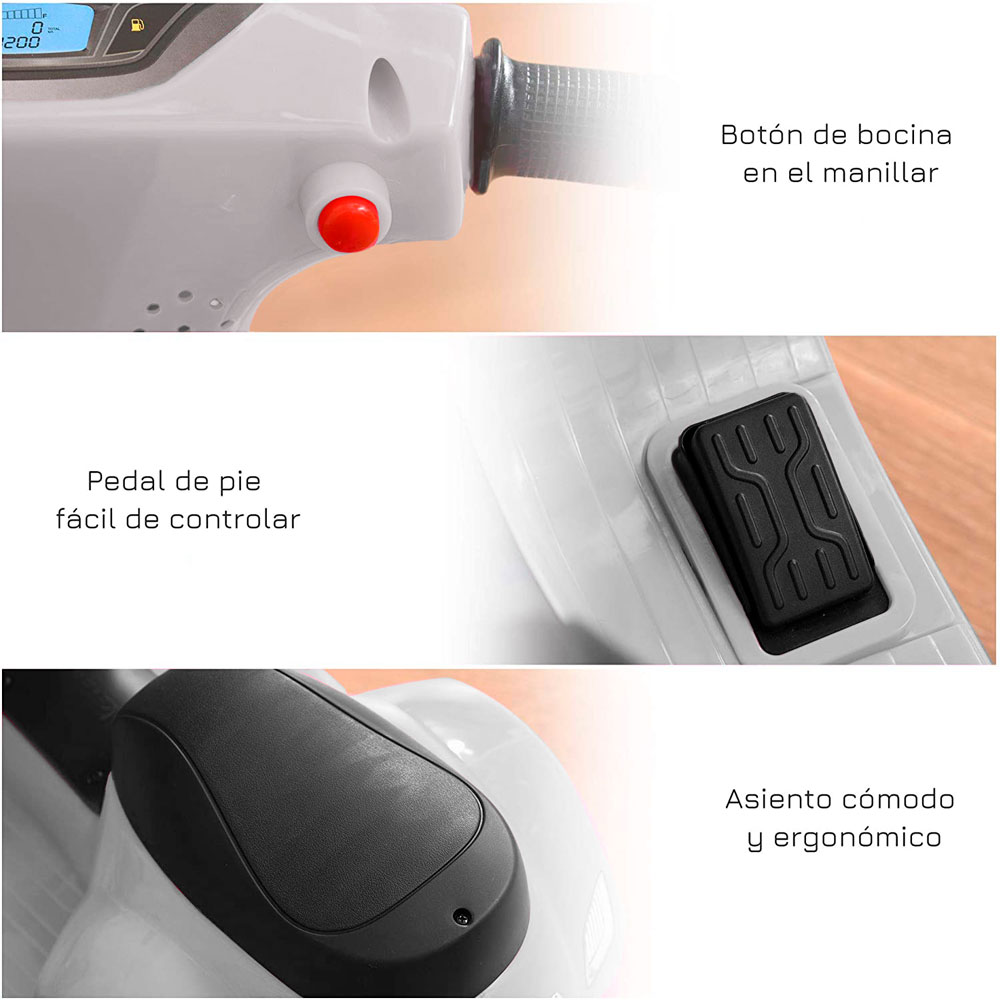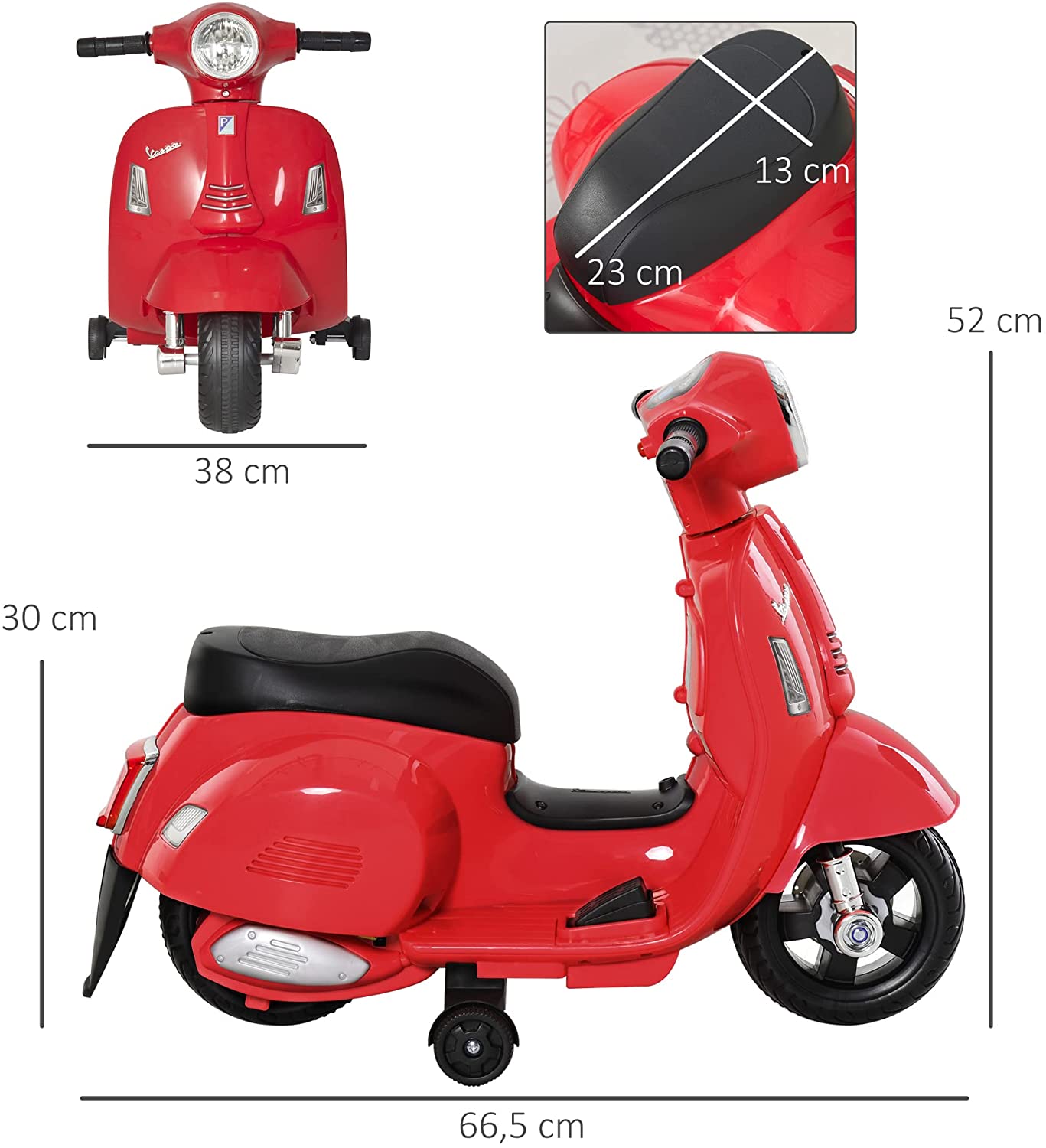Grande nouveauté ! Mini scooter électrique avec permis Vespa. Très facile à utiliser avec la pédale de commande et le volant. Il possède une grande stabilité, grâce à ses 4 roues (2 roues principales et 2 roues auxiliaires et amovibles). Votre petit sera très à l'aise sur ce véhicule amusant, car le siège extra large permet une conduite souple. C'est un jouet qui augmente leur capacité de coordination main-œil tout en les amusant beaucoup. Il est recommandé pour les enfants à partir de 18 mois et jusqu'à 3 ans. De plus... il est très facile à assembler ! Cette magnifique mini-moto est un cadeau qui ne manquera pas de plaire aux petits. Avec un bouton de klaxon sur le guidon et un phare avec lumière, ils seront les rois des balades ! Pouvez-vous l'imaginer en train de la conduire ? Je suis sûr que vous pouvez. Caractéristiques du produit : - Dimensions du produit : 66,5 x 38 x 52 cm - Poids : 4,7 kg - Poids maximum supporté : 25 Kg - Durée de vie de la batterie et du moteur : 45 min / 6v - Vitesse maximale : 4 km/h - Dimensions de la boîte : 61 x 31 x 31 x 35 cm - Poids avec emballage : 6 Kg