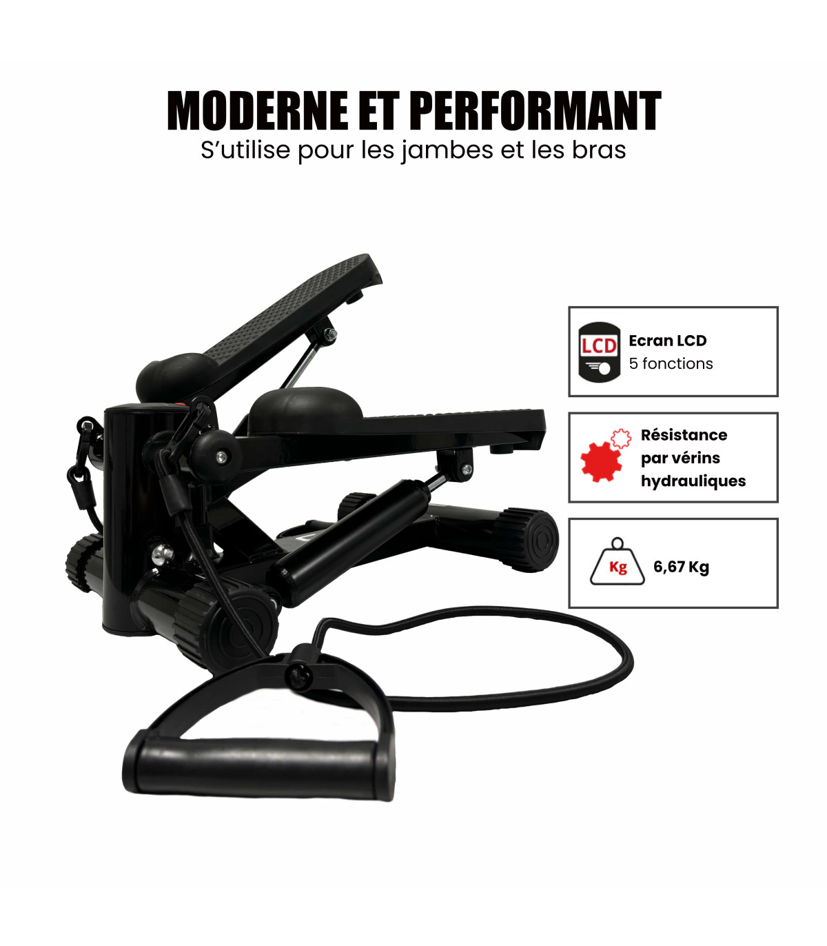 Des marches antidérapantes et des stabilisateurs pour plus de sécurité durant vos exercices : revêtement antidérapant, qui offre une adhérence optimale et empêche tout risque de glisse pendant l'entraînement. De plus, les stabilisateurs offrent une base solide, réduisant le risque de basculement et de chute et garantissant une utilisation sûre, même à des intensités élevées.