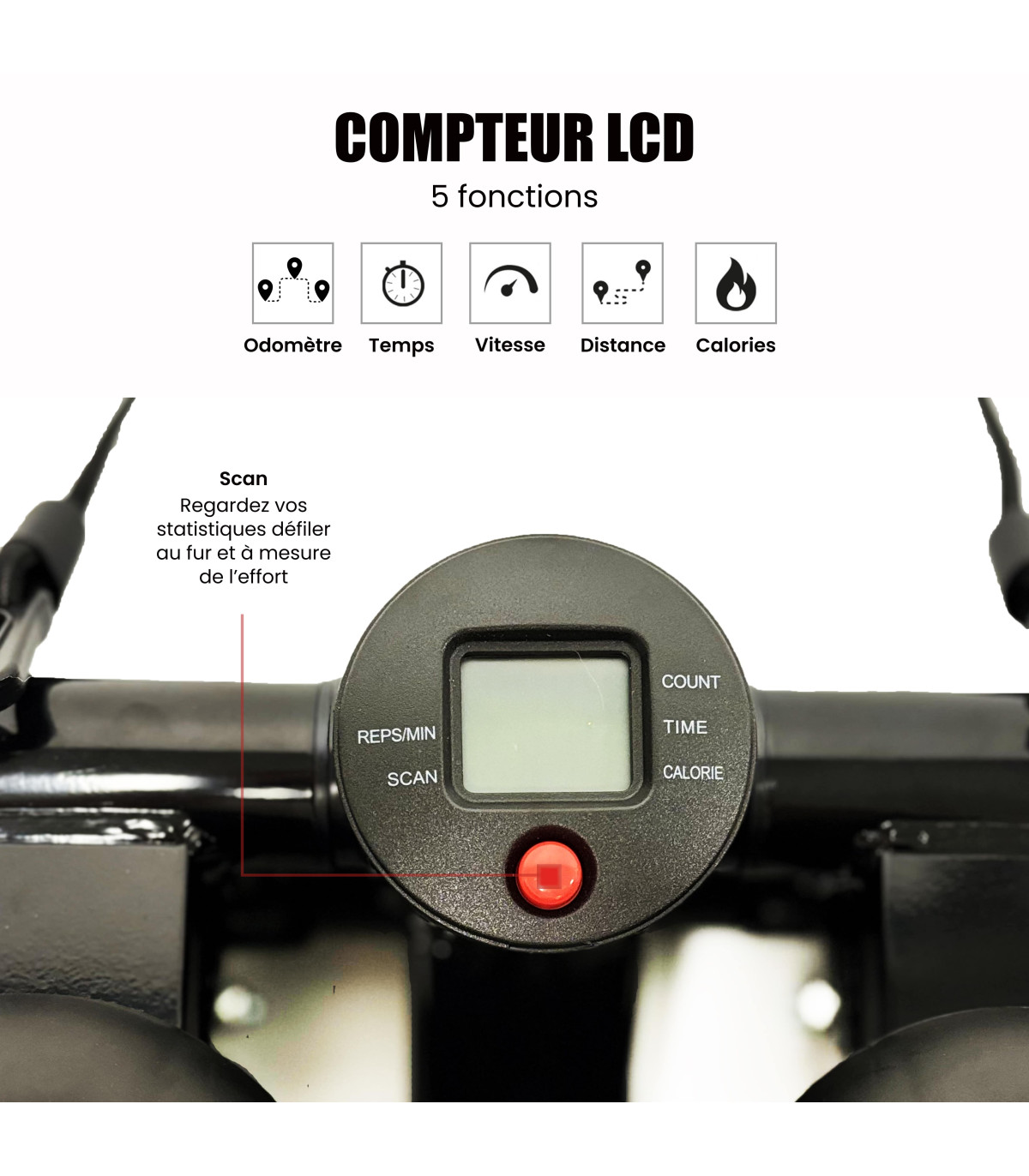 Un suivi des performances précis grâce au compteur LCD multifonction : le mini stepper dispose d'un écran LCD intégré qui vous fournit des données essentielles en temps réel pour optimiser votre séance d'entraînement, comme : le nombre de pas, les calories brûlées, la durée de l'entraînement, et des répétitions par minute. Il dispose également d'une fonction scan qui permet de faire défiler automatiquement ces différents indicateurs, offrant ainsi une vue d'ensemble complète de la session d'entraînement sans avoir à manipuler l'appareil. Mesurez facilement vos progrès et ajustez votre routine en fonction de vos objectifs de fitness grâce au compteur LCD !