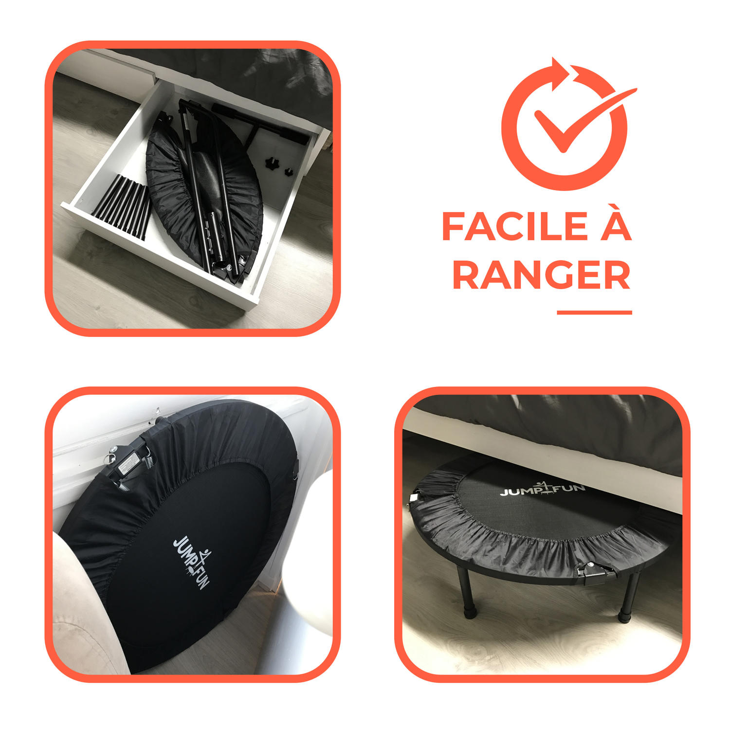 Le Mini trampoline Fitness Jump4Fun est idéal pour retrouver votre silhouette et renforcer votre condition physique, dans un but rééducatif ou simplement ludique. Ultra compact, la barre de maintien et les pieds se montent et se démontent aisément en quelques minutes. Vous pouvez ajuster celle-ci en fonction de votre taille sur 4 hauteurs pour varier la difficulté de l'exercice. Une fois replié, il tient largement dans un sac de sport standard. Les tubes en acier galvanisé apportent une grande solidité à l'ensemble supporté par des pieds en acier très résistant, pour plus de stabilité. La barre de maintien préserve votre équilibre et constitue une sécurité supplémentaire. Vous pouvez prendre appui sur sa poignée ergonomique pour pratiquer vos exercices. Un tapis de qualité vous assure plus de solidité. Sa surface douce et élastique préserve vos articulations des chocs violents grâce à sa détente souple et silencieuse. Une housse en polyester recouvre le contour du trampoline et permet de protéger les ressorts en acier inoxydable, vous empêchant ainsi de rebondir directement dessus, et de vous blesser malencontreusement. Marque : Jump4Fun Fitness Gamme : Trampoline Fitness Modèle : Poignée D - 122 Cm Dimensions Produit (L. X L. X H. Cm) : 122 X 122 X 130 Cm Poids Produit (Kg) : 11 Kg Matière : Acier Polyester Polypropylène Diamètre (Cm) : 122 CM Hauteur Minimale Barre / Hauteur Maximale Barre : Min 100 Cm / Max 130 Cm Nombre De Carton(S) : 1 A Monter Soi-Même : Oui Prémonté : Oui Un bon entretien de votre trampoline vous permet de prolonger sa longévité et d'assurer la sécurité de ses utilisateurs. Pour le nettoyage : Vous pouvez nettoyer la mousse du trampoline avec un chiffon propre, du savon doux et de l'eau claire. Évitez d'utiliser des produits abrasifs ou de l'eau chaude qui sont moins bien supportés par les différentes matières. Pour le stockage : Repliez simplement votre trampoline de fitness préalablement lavé, et stockez-le au sec dans un placard, un tiroir, ou sous un meuble. Il se glisse partout !