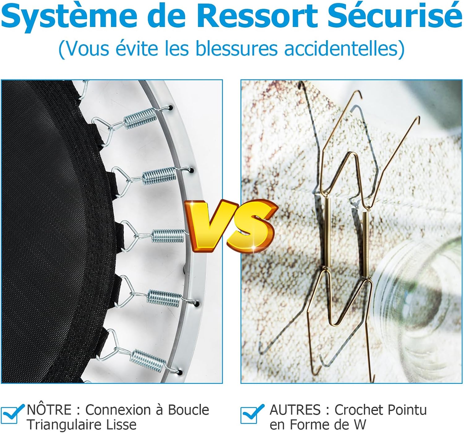 - Portance et élasticité élevée: Le tapis de saut du trampoline est en matériau PP, qui possède d'excellentes propriétés mécaniques. Le trampoline fitness dispose de 32 ressorts intégrés d'un diamètre de 3 mm, ce qui lui confère une bonne élasticité et une grande capacité de charge de 100 kg. L'élasticité élevée rend votre enfant plus amusant à utiliser et à aimer ce trampoline.