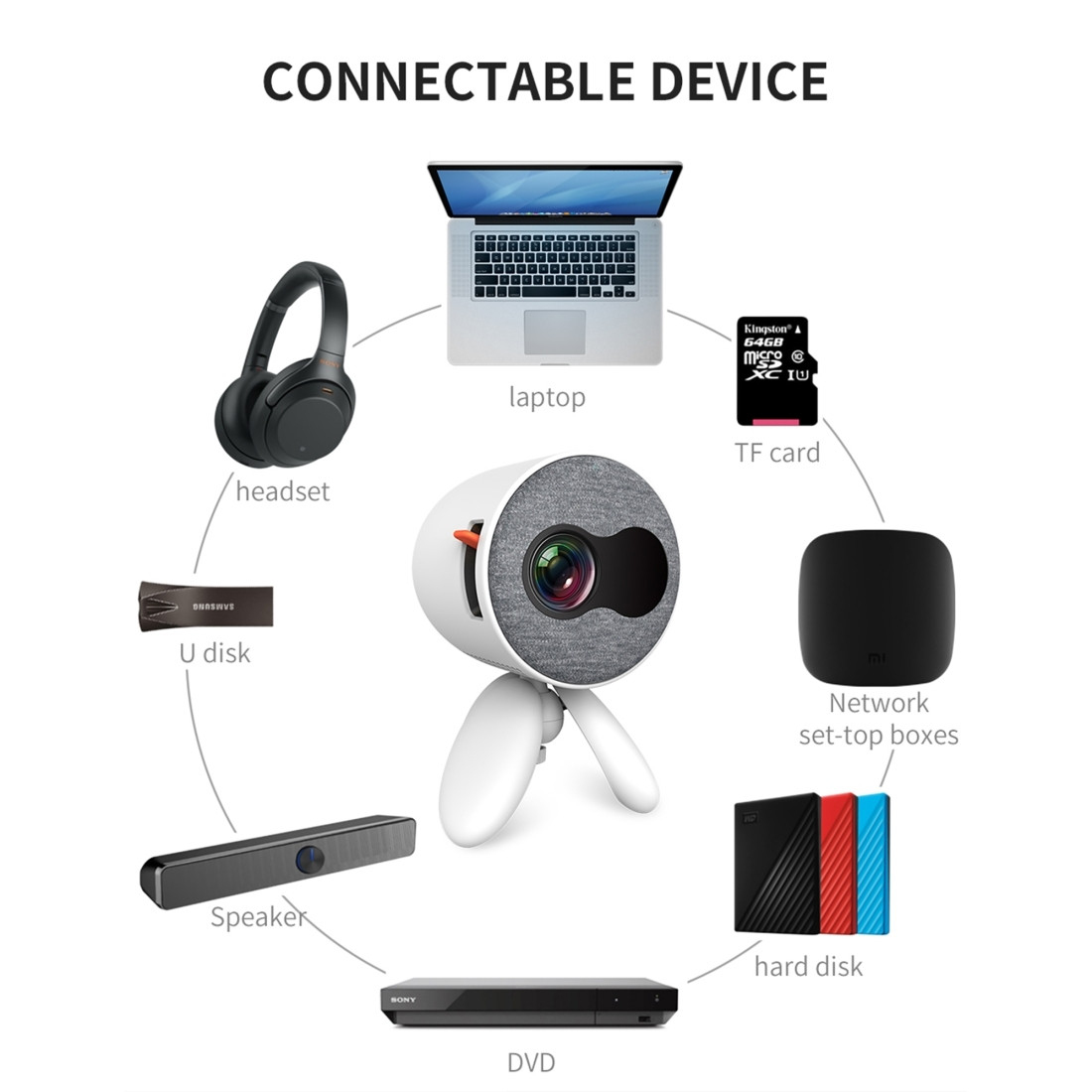 Grâce à son lecteur de carte micro SD, vous allez pouvoir insérer pour le visionnage plusieurs fichiers qu'ils soient vidéo, image et audio. Connectez également vos autres périphériques (smartphone, PC portable, consoles) puisque ce projecteur vidéo est équipé d'un port USB 2.0, d'un port HDMI et d'une prise Jack 3.5 mm.