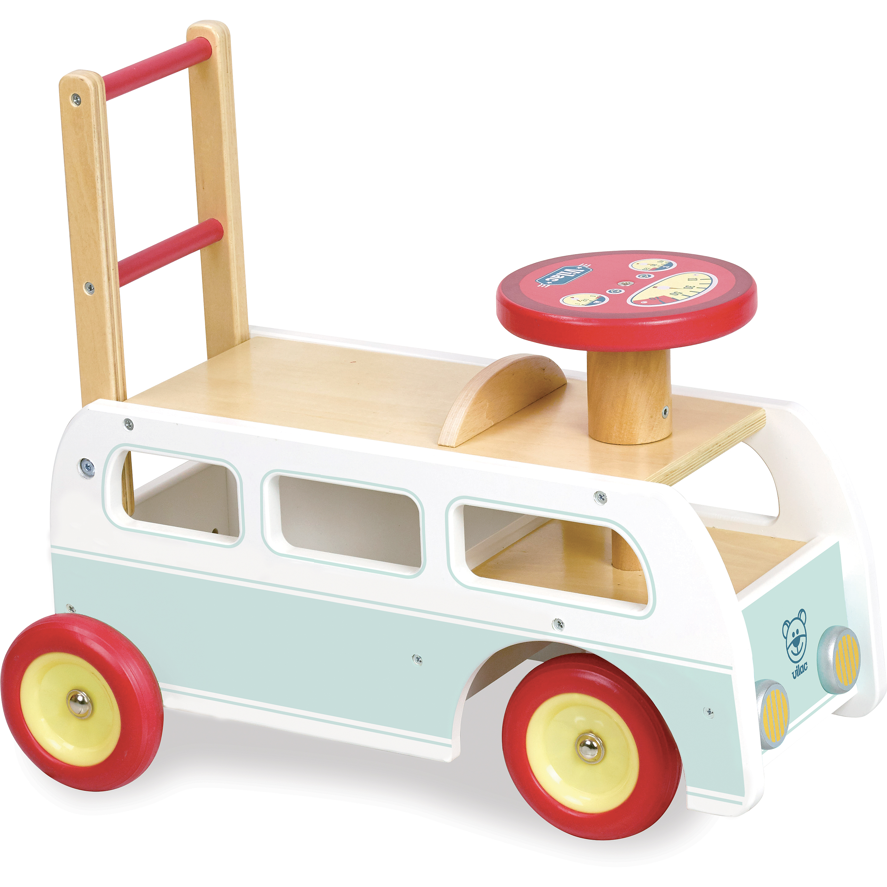 Minibus porteur 2 en 1 - tout en bois, ce porteur est aussi un chariot de marche. Il est équipé d'un volant qui tourne et d'un système anti-basculement à l'arrière. A monter soit même. Convient pour un enfant à partir de 18 mois. Assise 22 cm de haut.